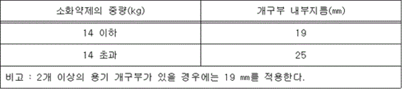 자동확산소화기의 형식승인 및 제품검사의 기술기준 [시행 2023. 7. 12.] [소방청고시 제2023-26호, 2023. 7. 12., 일부개정.] 소방청(소방산업과), 044-205-7511 제1조(목적) 이 기준은 「소방시설 설치 및 관리에 관한 법률」 제37조제5항에서 소방청장에게 위임한 자동확산소화기의 형식승인 및 제품검사의 기술기준에 관한 사항을 규정함을 목적으로 한다. 제2조(용어의 정의) 이 기준에서 사용하는 용어의 정의는 다음과 같다. 1. <삭제> 2. "자동확산소화기"란 화재 시 화염이나 열에 의하여 자동적으로 소화약제를 방출하여 소화하는 장치를 말한다. 3. "감지부"란 화재에 의해 발생하는 열에 의하여 자동적으로 화재의 발생을 감지하는 것을 말한다. 4. "방출구"란 화재의 소화를 위하여 소화약제를 유효하게 방사되도록 하는 부분을 말한다. 5. "방출도관"이란 소화약제를 저장용기(이하 "용기"라 한다)로부터 방출구에 이르도록 연결하는 굽힘성 있는 관을 말한다. 6. "일반화재용 자동확산소화기"란 소화기구 및 자동소화장치의 화재안전기준(이하 "화재안전기준"이라 한다)에서 정하고 있는 보일러실, 건조실, 세탁소, 대량화기취급소 등에 설치되는 자동확산소화기를 말한다. 7. "주방화재용 자동확산소화기"란 화재안전기준에서 정하고 있는 음식점, 다중이용업소, 호텔, 기숙사, 의료시설, 업무시설, 공장 등의 주방에 설치되는 자동확산소화기를 말한다. 8. "전기설비화재용 자동확산소화기"란 화재안전기준에서 정하고 있는 변전실, 송전실, 변압기실, 배전반실, 제어반, 분전반 등에 설치되는 자동확산소화기를 말한다. 9. "축압식 자동확산소화기"란 용기 중에 소화약제와 소화약제의 방출원이 되는 압축가스(질소 등)를 함께 봉입한 방식의 자동확산소화기를 말한다.<개정 2023. 7. 12.> 10. "가압식 자동확산소화기"란 소화약제의 방출원이 되는 가압가스를 별도의 전용용기(이하 "가압용가스용기"라 한다)에 충전한 방식의 자동확산소화기를 말한다.<개정 2023. 7. 12.> 제3조(일반구조) 자동확산소화기의 일반구조는 다음 각 호에 적합하여야 한다. 1. 작동이 확실하고 취급, 점검 및 정비가 용이하여야 하며 내구성이 있어야 한다. 2. <삭제> 3. 사람에게 해를 줄 수 있는 위험성이 없어야 한다. 4. 부품의 부착은 기능에 이상을 주지 않는 것으로 쉽게 풀리지 않도록 하여야 한다. 5. 작동 시 분해되는 모든 부분은 분사를 방해하지 아니하도록 분해되어 떨어져 나가야 한다. 6. 축압식 자동확산소화기에는 지시압력계를 설치하여야 한다. 다만 이산화탄소 및 할론1301 등 자체 증기압으로 방사되는 구조의 자동확산소화기는 제외할 수 있다.<개정 2023. 7. 12.> 7. <삭제> 8. 자동확산소화기의 주 기능에 영향을 미치는 부속장치를 설치하지 아니하여야 한다. 9. 자동확산소화기의 총중량은 설계값의 (-2 ∼ 5) % 이어야 한다. 다만, 이음매 없는 강제용기를 사용하는 경우에는 (-5 ∼ 15) % 이어야 한다. 10. 용기 개구부의 내부지름은 다음 표에서 정하는 크기 이상이어야 한다.