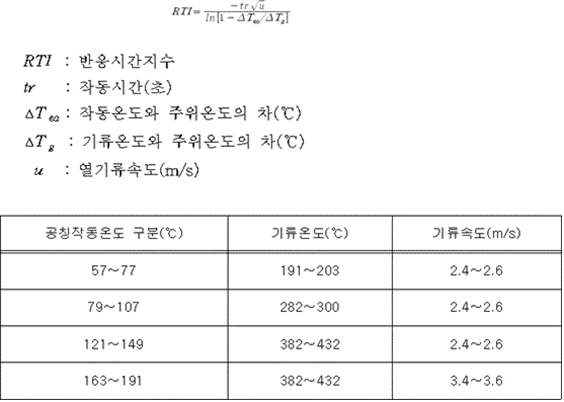 <개정 2023. 7. 12.> 11. 방출구 내경은 설계값의 ±0.2 ㎜ 이내이어야 한다.<개정 2023. 7. 12.> 12. 자동확산소화기는 손상, 변형 및 가공불량 등이 없어야 하며 각 부 치수의 허용공차는 KS B 0250(주조품 - 치수공차 및 절삭 여유방식), KS B ISO 2768-1(일반 공차 - 제1부: 개별 공차 지시가 없는 선 치수와 각도 치수에 대한 공차) 및 KS B 0413(판재의 프레스 가공품 일반 치수 공차)을 준용하여야 한다.<개정 2023. 7. 12.> 제4조(감지부) ① 이융성금속을 감지부로 사용하는 경우에는 다음 각 호에 적합하여야 한다. 1. 강도시험 감지부는 (20 ± 2) ℃(공칭작동온도가 75 ℃ 이상인 것은 최고주위온도 보다 20 ℃ 낮은 온도)의 공기 중에서 그 설계하중의 13배인 하중을 10일간 가하여도 파손되지 아니하여야 한다. 2. 작동시험 감지부를 액조 내에 넣어 그 감지부의 공칭작동온도 보다 10 ℃ 낮은 온도로부터 매분 1 ℃ 이내의 비율로 상승시키는 경우 감지부가 작동하는 온도의 실제 측정값은 공칭작동온도 ±3 % 이내이어야 한다. 3. 감도시험 감지부를 다음 표의 공칭작동온도 구분에 따라 별표 1에 의한 반응시간지수(RTI)시험장치에서 시험한 경우 다음 식으로 산정되는 반응시간지수(RTI)는 350 이하 이어야 한다.