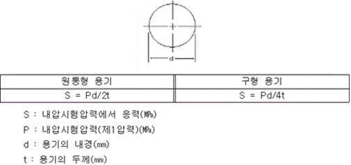 ② 유리벌브를 감지부로 사용하는 경우에는 다음 각 호에 적합하여야 한다.<단서삭제> 1. 강도시험 가. 유리벌브는 공칭작동온도보다 20 ℃ 낮은 온도로부터 매분 1 ℃ 이내의 비율로 유리벌브내의 기포가 없어질 때까지 또는 공칭작동온도보다 5 ℃ 낮은 온도까지 가열한 다음 대기 중에 놓아두어 유리벌브 내에 다시 기포가 생길 때까지 냉각하는 시험을 6회 반복하여도 이상이 없어야 한다. 나. 유리벌브는 공칭작동온도보다 20 ℃ 낮은 온도로부터 매분 1 ℃ 이내의 비율로 공칭작동온도보다 10 ℃ 낮은 온도까지 가열하고, 이 온도를 5분간 유지한 후 10 ℃의 물속에 넣어도 균열 또는 파손이 생기지 아니하여야 한다. 다. 유리벌브는 그 설계하중의 4배인 하중을 가하여도 균열 또는 파손되지 아니하여야 한다. 2. 작동시험 가. 유리벌브 감지부를 액조 내에 넣어 그 감지부의 공칭작동온도보다 10 ℃ 낮은 온도로부터 매분 1 ℃ 이내의 비율로 상승시키는 경우 감지부가 작동하는 온도의 실제 측정값은 공칭작동온도의 95 % 이상 115 % 이하이어야 한다. 나. 유리벌브는 제1호 가목의 시험을 하는 경우 유리벌브내의 기포소멸온도는 실제 측정한 값이 그 소멸온도의 설계값 ±3 % 이내이어야 한다. 3. 감도시험 유리벌브 감지부의 감도시험은 제1항제3호의 감도시험에 따른다. 제5조(용기) ① 용기의 재질은 KS D 3512(냉간 압연 강판 및 강대), KS D 5201(구리 및 구리합금 판 및 띠), KS D 3705(열간 압연 스테인리스 강판 및 강대) 또는 KS D 6701(알루미늄 및 알루미늄 합금의 판 및 띠)에 적합하거나 이와 동등 이상의 내식성이 있는 재질로 하고 그 두께는 0.71 ㎜ 이상이어야 한다.<개정 2023. 7. 12.> ② 원통형 및 구형의 용기 응력(S)은 다음 식에 따라 산출하는 경우 용기 재료에 대한 최대항복점의 80 % 이하 또는 최대인장강도의 50 % 이하이어야 한다. 이 경우 재료의 최대항복점 또는 최대인장강도를 정한 공인된 규격(KS 등)이 없는 때에는 당해 재료의 최대인장강도를 측정한 값을 적용한다.