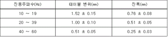 1) 가변진동시험 아래 표에서 제시하는 테이블 변위에서 2 Hz의 진동주파수 간격으로 5분간 지속한다.