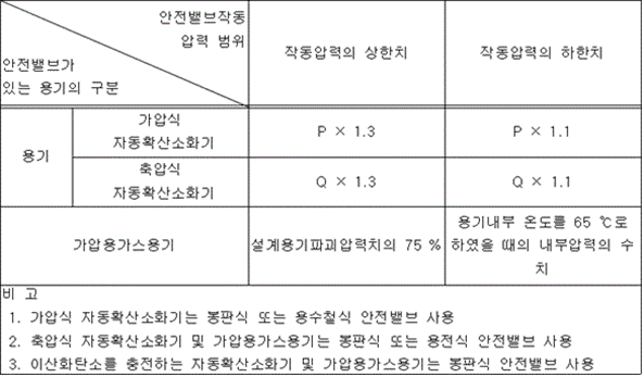 2) 내구진동시험 1)의 시험 후 60 ㎐의 진동주파수에서 2시간동안 진동시험을 실시한다. 4. 지시압력계의 압력검출부 및 그 접합부를 3 % 황산수용액, 3 % 염화나트륨수용액, 3 % 수산화나트륨수용액 중에 상온에서 각각 14일간 침지한 후 흐르는 물로 깨끗이 닦고 사용압력 상한값의 2배의 공기압력을 30분간 유지할 경우 누설되지 않아야 한다. 이 경우 투명판 및 눈금판을 제거하고 약액에 침지한다. 5. 지시압력계 압력표시의 지시압력값의 오차는 다음에 각 목에 적합하여야 한다. 가. 충전압력 표시 : 충전압력값의 ±4 % 나. 사용압력범위의 상한값과 하한값 : 충전압력값의 ±4 % (가스계자동확산소화기용 지시압력계는 충전압력값의 ±8 %) 다. 0값 표시 : 충전압력값의 (0 ∼ 12) % 라. 최대표시압력 표시 : 충전압력값의 ±15 % 6. 지시압력계를 사용압력 상한값의 2배의 공기압력으로 가압한 상태로 사용상한온도의 물에 30분간 침지하였을 경우 새지 아니하여야 한다. 7. 파열강도시험 지시압력계는 20 ℃ 충전압력의 6배에 해당하는 압력을 1분 동안 가하는 경우 파손되지 아니하여야 한다. 8. 방수시험 지시압력계는 제21조제3항에 따른 염수분무시험을 실시 한 후 0.3 m 깊이의 물에서 2시간 동안 침지하는 경우 물이 침투하여서는 안 된다. 9. 과압배출시험 지시압력계에서 압력이 누설되는 경우 압력을 배출시키는 구조이어야 하며, 350 kPa 이하의 압력에서 24시간 이내에 배출되어야 한다. 제13조 <삭제> 제14조(안전밸브) ① 가스계소화약제를 충전하거나 「고압가스안전관리법」의 적용을 받는 자동확산소화기 및 가압용가스용기의 밸브에는 안전밸브를 설치하여야 한다.<개정 2023. 7. 12.> ② 안전밸브는 다음 표에서 정하는 용기의 구분에 따라 각각 해당되는 작동압력의 상한치 및 하한치 범위 안의 압력(용전식 안전밸브는 상한치 및 하한치의 작동압력에 도달하는 온도)으로 작동하는 것이어야 한다.