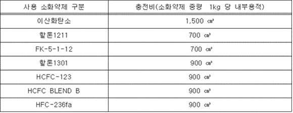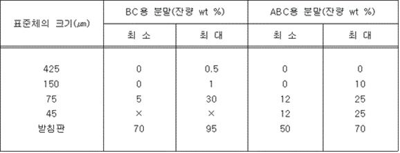 5. 겉보기비중은 0.8 g/mL 이상이어야 하고, 설계값 ±0.1 g/mL 이내이어야 한다. 6. 분말을 수면에 고르게 살포한 경우에 1시간 이내에 침강하지 아니하여야 한다. 7. 칼륨의 중탄산염이 주성분인 소화약제는 담회색으로 인산염 등이 주성분인 소화약제는 담홍색 또는 황색으로 착색하여야 하며 이를 혼합하지 아니하여야 한다. 8. 분말상태의 소화약제는 굳거나 덩어리지거나 변질 등 그 밖의 이상이 생기지 아니하여야 하며 침입도시험기(Penetrometer)로 시험한 경우 15 ㎜ 이상 침투되어야 한다. 9. 온도상승시험 (60 ± 2) ℃에서 7일간 보존하고 실온에서 3일간 보존한 후 유동성이 있어야 하며 고화되지 아니하여야 한다. 10. 절연내력시험 C급화재용은 최소 5 000 V의 교류전압을 가하는 시험에서 내전압에 이상이 없어야 한다. ③ 자동확산소화기에 충전하는 강화액소화약제는 다음 각 호에 적합한 수용액이어야 한다.<개정 2023. 7. 12.> 1. 알칼리금속염류의 수용액인 경우에는 알칼리성 반응을 나타내어야 한다. 2. 강화액소화약제의 응고점은 -20 ℃ 이하이어야 한다. 3. 강화액소화약제와 접촉하는 금속재료를 (50 ± 2) ℃에서 90일간 침지한 후 금속재료의 중량손실은 각각 1일에 1 ㎎/58.9 ㎠ 이하이어야 한다. 4. 강화액소화약제의 침전량은 (20 ± 2) ℃의 강화액소화약제를 원심분리용 시험관에 넣고 상대원심력을 분당 회전수 (600 ∼ 700)으로 원심 분리하여 생기는 침전물이 0.1 Vol % 이하이어야 한다. 5. 강화액소화약제의 변질시험((65 ± 2) ℃로 216시간 보존한 후 실온으로 환원하고, 다시 -(18 ± 2) ℃로 24시간 보존한 후 실온으로 환원시키는 시험) 후의 침전량은 제4호의 규정에 의한 방법으로 측정한 경우 0.2 vol % 이하이어야 한다. 6. 강화액소화약제의 표면장력은 33 mN/m 이하이어야 하며, 설계값의 -3.0 mN/m ∼ 1.5 mN/m이어야 한다. 다만, 주방화재용을 포함하는 소화약제의 경우에는 적용하지 아니한다. 7. 비중은 KS M 0004(화학 제품의 밀도 및 비중 측정 방법)의 비중부액계 또는 비중병 등을 사용하여 (20 ± 0.5) ℃에서 측정하였을 때 설계값의 ±0.02 이내이어야 한다. 8. 수소이온농도는 KS M 0011(수용액의 pH측정방법)에 따라 (20 ± 2) ℃에서 측정한 경우 pH 6 ∼ 9 범위이어야 하며, 설계값 ±0.4 이내이어야 한다. ④ 자동확산소화기에 충전하는 침윤수용액(물의 침투능력, 분산능력 및 유화능력 등을 증대하기 위하여 침윤제와 혼합한 약제를 말한다) 소화약제는 다음 각 호에 적합하여야 한다.<개정 2023. 7. 12.> 1. 침윤수용액의 표면장력은 33 mN/m 이하이어야 한다. 2. 용액의 분리시험 가. 침윤수용액은 0 ℃에서 50 ℃의 온도범위에서 분리되어서는 아니 된다. 나. 가목에서 규정한 시험을 하는 경우 침전현상(시험기간 중에 발생한 것도 포함한다), 흐려지는 현상 등 이와 유사한 현상 등은 분리현상으로 본다. 3. 금속부식시험 침윤수용액과 접촉하는 금속재료를 (50 ± 2) ℃에서 90일간 소화약제에 침지한 후 금속재료의 중량손실은 각각 1일에 1 ㎎/58.9 ㎠ 이하이어야 한다. 4. 침윤수용액은 부패하거나 변질 등이 발생하여서는 아니 된다. 5. 수소이온농도는 KS M 0011(수용액의 pH측정방법)에 따라 (20 ± 2) ℃에서 측정한 경우 pH 6 ∼ 9 범위이어야 하며, 설계값 ±0.4 이내이어야 한다. ⑤ 자동확산소화기에 충전하는 포소화약제는 다음 각 호에 적합한 수용액이어야 한다.<개정 2023. 7. 12.> 1. 포소화약제는 액체상태로서 방부처리를 하여야 한다. 다만, 부패ㆍ변질 등의 염려가 없는 것은 그러하지 아니하다. 2. 자동확산소화기로부터 방사되는 거품은 내화성을 지속할 수 있어야 한다. 3. (20 ± 2) ℃의 포소화약제를 충전한 자동확산소화기를 작동하여 방사되는 거품의 용량은 수용액 용량의 5배 이상이어야 하며, 방사종료 후 1분간 거품으로부터 환원되는 수용액이 방사 전 수용액의 25 % 이하이어야 한다. 4. 포소화약제의 침전량은 (20 ± 2) ℃의 포소화약제를 원심분리용 시험관에 넣고 상대원심력을 분당 회전수 (600 ∼ 700)으로 원심 분리하여 생기는 침전물이 0.1 vol % 이하이어야 한다. 5. 포소화약제의 변질시험 후의 침전량은 제4호의 규정에 의한 방법으로 측정한 경우 0.2 vol % 이하이어야 한다. 6. 비중은 KS M 0004(화학 제품의 밀도 및 비중 측정 방법)의 비중부액계 또는 비중병 등을 사용하여 (20 ± 0.5) ℃에서 측정하였을 때 설계값의 ±0.02 이내이어야 한다. 7. 점도는 KS M ISO 3104(석유제품 - 투명 및 불투명 액체 - 동점도 시험방법 및 점도 계산)에 따라 (20 ± 1) ℃에서 측정하였을 때 설계값의 ±30 % 이내이어야 한다. 8. 수소이온농도는 KS M 0011(수용액의 pH측정방법)에 따라 (20 ± 2) ℃에서 측정한 경우 pH 6 ∼ 9 범위이어야 하며, 설계값 ±0.4 이내이어야 한다. 9. 포소화약제와 접촉하는 금속재료를 (50 ± 2) ℃에 90일간 소화약제에 침지한 후 금속재료의 중량손실은 각각 1일에 1 ㎎/58.9 ㎠ 이하이어야 한다. 10. 합성계면활성제 및 수성막포의 표면장력은 33 mN/m 이하이어야 하며, 설계값의 -3.0 mN/m부터 +1.5 mN/m까지의 범위이어야 한다. 11. 응고점은 사용하한온도 이하이어야 한다. 12. 수성막포는 거품을 유면에 덮은 후 6회의 수성막시험을 하였을 때 순간적으로 착화하