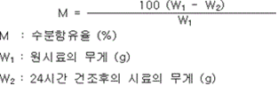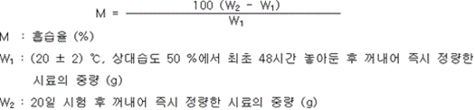 4. (20 ± 2) ℃, 50 % 상대습도에서 48시간 보존하고 다시 (20 ± 2) ℃, 80 % 상대습도에서 48시간 동안 보존하는 시험을 반복하여 20일간 시험하는 경우 아래의 수식으로 계산한 흡습율이 중탄산나트륨이 주성분인 것은 0.2 wt %, 중탄산칼륨이 주성분인 것은 2 wt %, 인산염류 등이 주성분인 것은 1.5 wt % 이하이어야 하며, 시험 후 시료는 유동성이 있고 고화되지 아니하여야 한다.