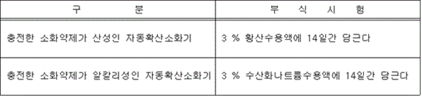2. <삭제> 3. <삭제> ② 가압식 자동확산소화기의 가스도입관은 제1항제1호의 표에서 정하는 가압식 자동확산소화기 구분에 따른 제2압력(용기와 가압용가스용기 사이에 압력조정기가 있는 가스도입관은 20 ㎫)의 수압력을 5분간 가하는 시험을 하는 경우 물이 새거나 현저한 변형이 생기지 아니하여야 한다.<개정 2023. 7. 12.> 제21조(내식 및 방청시험) ① 자동확산소화기의 충전된 소화약제와 접촉하는 부분은 그 소화약제에 의하여 부식되지 아니하는 내식성 재질로 제조하거나 그 부분에 내식가공을 하여야 하며, 외부와 접촉하는 부분은 내식성이 있는 재질로 제조하거나 그 부분에 부식되거나 녹슬지 아니하도록 내식가공 또는 방청가공을 하여야 한다.<개정 2023. 7. 12.> ② 충전한 소화약제와 상시 접촉하는 부분은 다음 각 호의 부식시험을 하는 경우 녹슬거나 그 밖의 이상이 없어야 한다. 다만, 내식성재질로 제조된 것은 부식시험을 생략할 수 있다.<개정 2023. 7. 12.> 1. 3 %의 염화나트륨수용액 중에 14일간 담그어 실시하는 부식시험(축압식 자동확산소화기 중 분말소화약제를 사용하는 것은 제외한다) 2. 액체계소화약제를 충전한 경우에는 제1호에서 규정한 부식시험 외에 (사용상한온도 ± 2) ℃에서 충전한 소화약제에 90일 동안 노출시키는 시험과 다음 표에서 정하는 시험