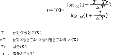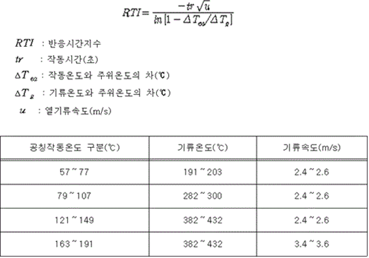 <개정 2012. 12. 31., 2024. 7. 25.> ③ 유리벌브를 감지부로 사용하는 경우에는 다음 각 호에 적합하여야 한다. 다만, 유리벌브 감지부가 법 제37조에 따라 제품검사에 합격한 것은 시험을 생략할 수 있다.<개정 2012. 6. 27., 2024. 7. 25.> 1. 강도시험 가. 유리벌브는 공칭작동온도보다 20 ℃ 낮은 온도로부터 매분 1 ℃이내의 비율로 유리벌브내의 기포가 없어질 때까지 또는 공칭작동온도보다 5 ℃ 낮은 온도까지 가열한 다음 대기 중에 놓아두어 유리벌브 내에 다시 기포가 생길 때까지 냉각하는 시험을 6회 반복하여도 이상이 없어야 한다.<개정 2024. 7. 25.> 나. 유리벌브는 공칭작동온도보다 20 ℃ 낮은 온도로부터 매분 1 ℃이내의 비율로 공칭작동온도보다 10 ℃ 낮은 온도까지 가열하고, 이 온도를 5분간 유지한 후 10 ℃의 물속에 넣어도 균열 또는 파손이 생기지 않아야 한다. 다. 유리벌브는 그 설계하중의 4배인 하중을 가하여도 균열 또는 파손되지 않아야 한다. 2. 작동시험<개정 2024. 7. 25.> 가. 유리벌브 감지부를 액조 내에 넣어 그 감지부의 공칭작동온도보다 10 ℃ 낮은 온도로부터 매분 1 ℃ 이내의 비율로 상승시키는 경우 감지부가 작동하는 온도의 실제 측정값은 공칭작동온도의 95 % 이상 115 % 이하이어야 한다.<개정 2024. 7. 25.> 나. 유리벌브는 제1호가목의 시험을 하는 경우 유리벌브내의 기포소멸온도는 실제 측정한 값이 그 소멸온도의 설계값 ±3 % 이내이어야 한다.<개정 2024. 7. 25.> 3. 감도시험 유리벌브 감지부의 감도시험은 제2항제3호의 감도시험에 따른다.<개정 2024. 7. 25.> ④ 온도센서를 감지부로 사용하는 경우에는 다음 각 호에 적합하여야 한다. 1. 감지부는 기류의 방향에 따라 기능이 현저하게 변화되지 않아야 한다. 2. 감지부는 설치위치에서 45도 경사지게 설치한 경우 기능에 이상이 생기지 않아야 한다. 3. 작동시험 감지부는 공칭작동온도의 125 % 온도와 풍속 1 m/s의 수직기류에 투입하는 경우 다음 식으로 산정되는 시간(t) 이내에 작동되어야 한다.