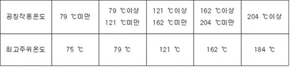 4. 부작동시험 감지부는 공칭작동온도보다 20 ℃ 낮은 온도(공칭작동온도가 75 ℃ 이상인 것에 있어서는 다음 표의 공칭작동온도에 따라 구분한 최고주위온도보다 20 ℃ 낮은 온도)의 풍속 1 m/s인 수직기류 중에 10분간 보존하는 경우 이상이 생기지 않아야 한다.