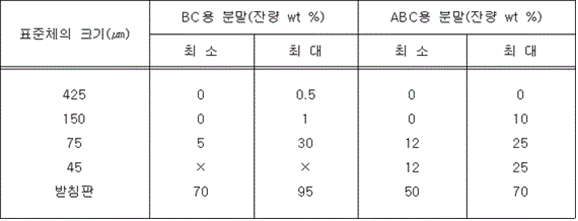 <신설 2024. 7. 25.> 2. 분말의 성분비는 다음에 적합한 것이어야 한다.<신설 2024. 7. 25.> 가. 주성분이 중탄산나트륨인 소화약제는 중탄산나트륨(NaHCO3)이 90 wt % 이상이어야 한다. 나. 주성분이 중탄산칼륨인 소화약제는 중탄산칼륨(KHCO3)이 90 wt % 이상이어야 한다. 다. 주성분이 인산염류 등인 소화약제는 제1인산암모늄(NH4H2PO4) 등 함량이 최소 75 wt % 이상이어야 하며, 설계값의 -5 % ~ +15 % 이어야 한다. 3. 상대습도가 50 % 이하인 대기 중에서 시료를 정량하여 농도 (95 ∼ 98) %의 농황산을 건조제로 사용한 데시게이터 내에 (18 ∼ 24) ℃로 24시간 놓아둔 후 정량하여 아래 수식으로 계산한 수분함유율이 0.2 wt % 이하이어야 한다.