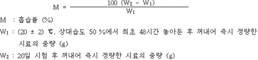 4. (20 ± 2) ℃, 50 % 상대습도에서 48시간 보존하고 다시 (20 ± 2) ℃, 80 % 상대습도에서 48시간 동안 보존하는 시험을 반복하여 20일간 시험하는 경우 아래의 수식으로 계산한 흡습율이 중탄산나트륨이 주성분인 것은 0.2 wt %, 중탄산칼륨이 주성분인 것은 2 wt %, 인산염류 등이 주성분인 것은 1.5 wt % 이하이어야 하며, 시험 후 시료는 유동성이 있고 고화되지 아니하여야 한다.