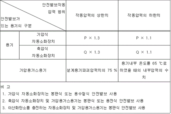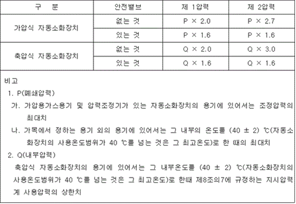 <신설 2024. 7. 25.> ② 소화약제의 방출원이 되는 가압가스를 별도의 전용용기(이하 "가압용가스용기"라 한다)에 충전한 방식(이하 "가압식"이라 한다)의 자동소화장치의 가스도입관은 제1항제1호의 표에서 정하는 가압식 자동소화장치 구분에 따른 제2압력(용기와 가압용가스용기 사이에 압력조정기가 있는 가스도입관은 20 ㎫)의 수압력을 5분간 가하는 시험을 하는 경우 물이 새거나 현저한 변형이 생기지 아니하여야 한다.<개정 2024. 7. 25.> 제17조(안전밸브) ① 가스계소화약제를 충전하거나 「고압가스안전관리법」의 적용을 받는 분사식 자동소화장치 및 가압용가스용기의 밸브에는 안전밸브를 설치하여야 한다.<신설 2024. 7. 25.> ② 안전밸브의 구조는 다음 각 호에 적합하여야 한다.<개정 2024. 7. 25.> 1. 함부로 분해 또는 조정할 수 없어야 한다. 2. 용기 내의 압력을 유효하게 감압할 수 있어야 한다.<개정 2024. 7. 25.> 3. 안전밸브의 부착나사는 한국산업표준(KS)이나 외국의 공인된 나사규격에 적합하여야 하며, 패킹을 끼울 때에는 확실하게 부착부위에 접합되어야 한다.<개정 2024. 7. 25.> 4. 봉판식 안전밸브에 있어서는 분출구에 봉인을 하여야 한다. 5. 안전밸브에는 "안전밸브"라고 표시하여야 한다. ③ 안전밸브는 다음 표 좌측에 정하는 용기의 구분에 따라 각각 해당되는 작동압력의 상한치 및 하한치 범위 안의 압력(용전식 안전밸브는 상한치 및 하한치의 작동압력에 도달하는 온도)으로 작동하는 것이어야 한다.