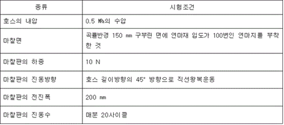 <개정 2019. 1. 10., 2024. 4. 19.> 제21조(비뚤어짐) 호스는 사용압의 2배에 해당하는 수압력을 가하는 경우 호스의 비뚤어짐이 0.1 ㎫의 수압을 가한 상태의 호스를 기준으로 하여 500 ㎜ 이하이어야 한다.<개정 2024. 4. 19.> 제22조(내마모성) 호스는 다음 표에 정한 시험조건에 의한 마찰시험을 하는 경우 사용압 2.0 ㎫은 100회, 사용압 1.6 ㎫은 80회, 사용압 1.3 ㎫은 50회, 사용압 0.9 ㎫는 30회, 사용압 0.7 ㎫은 20회의 마찰을 견디어야 한다.