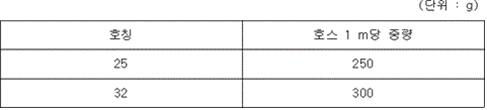 <개정 2019. 1. 10.> 제24조(자켓트의 구조) 호스 자켓트의 구조는 제12조의 각호에 적합하여야 한다. 제25조(고무 및 합성수지의 품질) ① 호스의 내장 및 피복에 사용하는 고무는 제13조제1항의 각 호의 규정에 적합하여야 한다. ② 호스의 내장 및 피복에 사용하는 합성수지는 제13조제1항제1호 및 제2호와 제3항제1호, 제3호 및 제4호의 규정에 적합하여야 한다. 제26조(내장) 호스의 내장은 다음 각 호에 적합하여야 한다. 1. 고무 및 합성수지의 두께는 0.2 ㎜ 이상이어야 한다. 2. 쟈켓트와의 밀착강도는 KS M 6518(가황 고무 물리 시험방법)의 박리시험(시험편의 치수는 가로 25 ㎜, 세로 100 ㎜)을 실시한 경우에 박리하중은 30 N 이상이어야 한다. 3. 표면에 주름살 등의 불균일한 부분이 없어야 하며, 물에 의한 마찰손실이 적은 것이어야 한다. 제27조(피복 및 도장) ① 호스의 고무 또는 합성수지의 피복은 제26조제2호의 규정에 적합하여야 한다. ② 호스의 고무 또는 합성수지의 도장은 쟈켓트에 균일하고 확실하게 밀착된 것이어야 한다. 제28조(길이) 호스의 길이는 건조한 상태에서 15 m이상으로 하며 표시된 길이의 110 %이내 이어야 한다. 다만, 길이는 5 m씩 추가할 수 있다. 제29조(중량) 호스의 중량은 완전히 건조한 상태에서 호칭에 따라 다음 표에 기재된 수치 이하이어야 한다. 다만, 쟈켓트에 피복이 되어 있는 것으로서 사용상 지장이 없는 것은 그러하지 아니하다.
