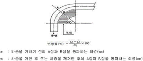 <개정 2019. 1. 10.> 제33조(비뚤어짐) 호스는 그 종류에 따른 사용압을 가하는 경우 호스의 비뚤어짐이 0.1 ㎫의 수압을 가한 상태의 호스를 기준으로 하여 650 ㎜ 이하이어야 한다. 제34조(내마모성) 호스는 제22조의 표에서 정한 시험조건에 따라 마찰시험을 할 경우에 사용압 0.9 ㎫는 20회, 사용압 0.7 ㎫은 10회의 마찰에 견디는 것이어야 한다. 제35조(변형률) ① 호스의 한쪽 끝을 다음의 그림과 같은 형태로 고정하고 최소곡률반경을 갖는 침목에 90°로 구부려 그 끝단에 20 N의 하중을 가하여 30분간 방치한 경우 변형률(계산식에 따라 산출된 것을 말한다. 이하 같다)이 10 % 이하이어야 하고, 하중을 제거한 후에는 변형률이 5 % 이하이어야 한다.