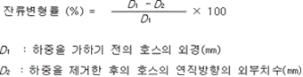 ② 호스는 길이 10 ㎝ 부분에 600 N의 하중을 10초간 가한 후에 다음 각 호에 적합하고, 파손ㆍ균열 등의 현저한 변형이 생기지 아니하여야 한다. 1. 그 종류에 따라 사용압을 1분간 가하고, 수압을 제거한 후 다음의 계산식에 따라 산출된 잔류변형률이 5 % 이하이어야 한다.