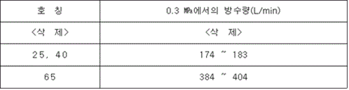 2. 고무재료를 2분 동안 표시된 길이의 2배만큼 인장시킨 후 해지한 경우 변형률은 25 % 이하이어야 한다. 3. 고무링은 KS B 2805(O-링) 운동용 O링 1종 A에 적합하거나 이와 동등 이상의 강도ㆍ내유성 및 내노화성이 있는 것이어야 한다. 제9조의2(수력작동시험) ① 개폐기능이 있는 관창은 소화전용인 경우 1.5 ㎫, 소방자동차용 등 기타 용도의 경우 3.1 ㎫의 압력을 1분간 가한 후 방수압력 345 ㎪ 및 689 ㎪에서 개폐 조작하는 경우 기능에 이상이 없어야 하며, 제8조(내압력)에 적합하여야 한다.<개정 2024. 4. 19.> ② 정유량형 관창은 방수량이 정격방수량의 100 % 이상 110 % 이하의 범위로 유지되어야 한다. ③ 정압형 관창의 정격유입압력은 586 ㎪ 이상 792 ㎪ 이하의 범위로 유지되어야 한다. 제9조의3(저ㆍ고온충격시험) -32 ℃ 및 57 ℃의 항온조에 24시간 방치 후 1.8 m 높이에서 콘크리트바닥에 자유 낙하하는 경우, 다음 각 호에 적합하여야 한다.<개정 2024. 4. 19.> 1. 직사형 관창 : 제8조(내압력)에 적합할 것 2. 방사형 관창 : 제9조의2(수력작동시험)에 적합할 것 제10조(염수분무시험) 관창은 KS D 9502(염수분무시험방법(중성, 아세트산 및 캐스 분무시험)에 의하여 (5 ± 1) wt%의 중성 염수분무에 (240 ± 2)시간 동안 노출하는 때에 부식이 생기지 아니하여야 하며, 제13조(제어시험)제1항 및 제2항에 적합하여야 한다.<신설 2024. 4. 19.> 제11조(비금속물질 노화시험) 비금속물질(고무재 제외)이 사용된 관창은 다음 각 호의 시험을 실시한 후 제9조의3(저ㆍ고온충격시험)(단, 저ㆍ고온 전처리는 생략한다)의 시험을 실시하는 경우 균열, 파손 및 누수 등이 없어야 한다.<신설 2024. 4. 19.> 1. 내후성시험은 아래 표 중 어느 하나의 조건으로 시험장치를 구성하여 시험한다.