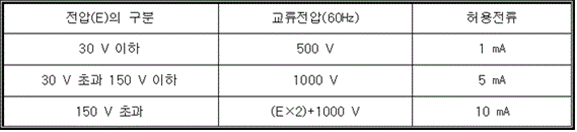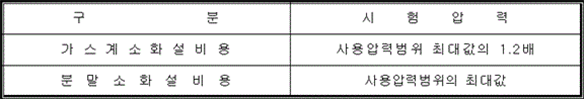 제8조의2(가스부식시험) 솔레노이드식 작동장치 및 모터식 작동장치는 5 L의 시험기 중에 농도 40 g/L의 티오황산나트륨 수용액 500 mL를 넣고 1규정농도의 황산 156 mL를 1 000 mL 물에 용해한 용액을 12시간마다 10 mL씩 가하여 발생하는 아황산가스 중에 4일간 놓아두는 시험을 한 후 균열 또는 파손이 없어야 하며 제9조(기능시험)에 적합하여야 한다.<신설 2018. 10. 12.> 제8조의3(절연저항시험) 솔레노이드식 작동장치 및 모터식 작동장치는 가동코일부(개폐부)와 비충전 금속부사이의 절연저항이 5 ㏁ 이상이어야 한다.<신설 2018. 10. 12.> 제8조의4(절연내력시험) 솔레노이드식 작동장치 및 모터식 작동장치는 가동코일부(개폐부)와 비충전 금속부 사이를 60 ㎐의 정현파에 가까운 교류전압을 다음 표에 따라 가하는 경우 1분간 견디어야 하며, 제9조(기능시험)에 이상이 생기지 않아야 한다.