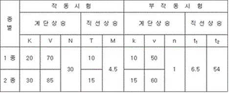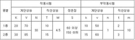 1. 작동시험 가. 실온보다 K ℃ 높은 온도이고 풍속이 V ㎝/s인 수직기류에 투입하는 경우 N초 이내에 작동하여야 한다. 나. 실온에서부터 T ℃/min의 직선적인 비율로 상승하는 수평기류에서 투입하는 경우 M분 이내에 작동하여야 한다. 다. 실온에서부터 1 ℃/min의 직선적인 비율로 상승하는 수평기류를 가하는 경우 S보다 10 ℃의 낮은 온도에서부터 S보다 10 ℃ 높은 온도까지의 온도범위에서 작동하여야 한다. 2. 부작동시험 가. 실온보다 k ℃ 높은 온도이고 풍속이 v ㎝/s인 수직기류에 투입하는 경우 n분 이내에 작동하지 않아야 한다. 나. 실온에서부터 t ℃/min의 직선적인 비율로 상승하는 수평기류를 가하는 경우 정온점보다 10 ℃ 낮은 온도에 도달하지 아니하는 범위내에서는 m분 이내에 작동하지 않아야 한다. 제18조(이온화식감지기의 공칭축적시간의 구분, 화재정보신호 및 감도시험) ① 이온화식감지기(축적형에 한한다)의 축적시간은 5초 이상 60초 이하로 하고 공칭축적시간은 10초 이상 60초의 범위에서 10초 간격으로 한다. ② 이온화식감지기(아날로그식은 제외)의 감도는 그 종별 및 공칭축적시간에 의하여 다음 표의 K, V, T 및 t의 값에 따라 다음 각 호의 시험에 적합하여야 한다.