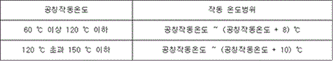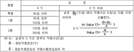<개정 2024. 4. 9.> 2. 부작동시험 공칭작동온도 보다 10 ℃ 낮은 온도이고 풍속이 1 m/s인 수직기류에 투입하는 경우 10분 이내에 작동하지 않아야 한다. ③ 아날로그식 정온식감지기는 공칭감지온도범위(설계치)의 각 온도에서 다음 각 호의 시험에 적합하여야 한다.<개정 2024. 4. 9.> 1. 2 ℃/min 이하로 일정하게 직선적으로 상승하는 풍속 1 m/s의 수평기류를 공칭감지온도의 최저온도에서 최고온도까지 가하는 경우 온도에 대응하는 화재정보신호를 발신하여야 한다. 2. 공칭감지온도범위의 임의의 온도에서 제2항제1호에 따른 특종의 작동시험에 적합하여야 한다.<개정 2024. 4. 9.> 제16조의2(정온식스포트형감지기의 감도설계값시험) 정온식스포트형감지기(아날로그식은 제외한다)는 풍속이 1 m/s인 수직기류에 투입하고 공칭작동온도에서 0.5 ℃/min의 비율로 온도를 상승시킬 경우 다음 표에서 정하는 작동 범위 내에서 작동하여야 한다.