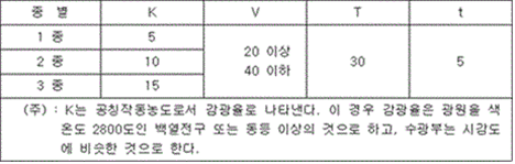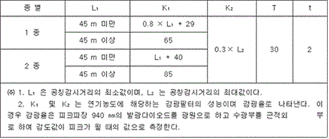 <개정 2024. 4. 9.> 1. 작동시험 1 m당 감광율 1.5 K인 농도의 연기를 포함하는 풍속이 V ㎝/s의 기류에 투입하는 경우 비축적형인 것은 T초 이내에서 작동하고, 축적형은 T초 이내에서 감지한 후 공칭축적시간 ± 5 범위에서 화재신호를 발신하여야 한다. 2. 부작동시험 1 m당 감광율 0.5 K인 농도의 연기를 포함하는 풍속 V ㎝/s의 기류에 투입하는 경우 t분 이내에는 작동하지 않아야 한다. ③ 분리형의 경우 공칭감시거리는 5 m 이상 100 m 이하로 하며 5 m 간격으로 한다. ④ 분리형광전식감지기(아날로그식은 제외)의 경우 감도는 그 종별, 공칭축적시간 및 공칭감시거리에 의하여 다음 표의 K1, K2, T 및 t의 값에 따라 다음 각 호의 시험에 적합하여야 한다.
