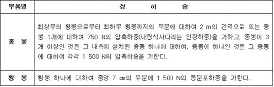 <개정 2011. 5. 13., 2015. 1. 15., 2024. 5. 7.> 제8조(강도) 피난사다리는 다음 각 호에 적합하여야 한다. 1. 피난사다리의 종봉 및 횡봉은 종봉의 방향으로 다음 표에 기재된 정하중을 가하는 시험(하향식피난구용 내림식사다리의 경우에는 별도 1의 시험기구를 사용하여 시험한다)에서 영구변형이 생기지 아니하여야 한다.
