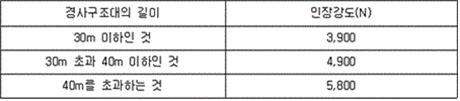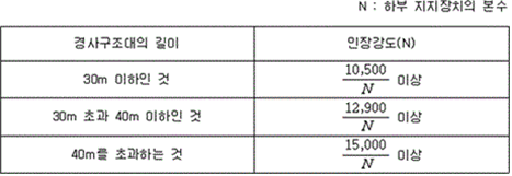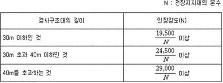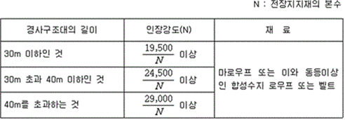 2. 전장지지재를 설치하지 아니한 경사구조대에는 포지와 고정틀과의 결합부분의 강도는 KS K 0521(텍스타일-천의 인장 성질-인장 강도 및 신도 측정: 스트립법(Strip Method))에 따라 시험하는 경우, 지탱하는 하중이 2.5 kN 이상이어야 한다. 3. 전장지지재를 설치한 경사구조대에서 전장지지재와 고정틀과의 결합부의 강도는 경사구조대의 길이에 따라 다음 표에 따른 하중을 가한 경우 이상이 없어야 한다.
