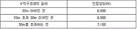 2. 전장지지재를 설치하지 아니한 수직구조대에서 포지와 고정틀 및 결합부분의 강도는 KS K 0521(텍스타일-천의 인장성질-인장강도 및 신도측정: 스트립법)에 따라 시험하는 경우, 지탱하는 하중이 2.5 kN 이상이어야 한다. 다만, 강하 시 직접 하중을 받지 않는 부분은 제외한다. 3. 전장지지재를 설치한 수직구조대에서 전장지지재와 고정틀과의 결합부 강도는 수직구조대 길이에 따라 다음표에 따른 하중을 가한 경우 이상이 없어야 한다.