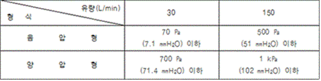 <개정 2024. 4. 19.> 나. (90 ± 2) ℃의 온도중에 8시간 이상 놓아둔 후 점착ㆍ균열 등이 생기지 아니하여야 한다. 다. (-20 ± 2) ℃의 온도중에 3시간 놓아둔 후 파손ㆍ균열 등이 생기지 아니하여야 한다. 라. (70 ± 2) ℃의 온도중에 72시간 놓아둔 후의 가열 감량이 3 %미만이어야 한다. 5. 안면렌즈의 재료는 다음 각 목에 적합하여야 한다. 가. (120 ± 2) ℃의 온도중에 8시간 놓아둔 후 점착ㆍ균열 등이 생기지 아니하여야 한다. 나. (-20 ± 2) ℃의 온도중에 3시간 놓아둔 후 균열ㆍ파손 등이 생기지 아니하여야 한다. 다. KS M 3015(열 경화성 플라스틱 일반 시험 방법) 6.24.1 A법에 의해 연소시켰을 때 자연 연소되지 아니하여야 한다.<개정 2024. 4. 19.> 라. 톨루엔, 벤젠, 솔벤트나프타, 메탄올 및 등유 등의 각 용해제에 용해ㆍ변질 등이 생기지 아니하여야 한다. 6. 각 부품의 결합부 등에 사용되는 고무패킹은 KS M 6614(공업용 고무 패킹 재료)의 B형 Ⅱ급 이상의 일반시험 또는 이와 동등이상의 강도ㆍ내유성 및 내노화성이 있는 것이어야 한다. 7. 공기호흡기에 사용되는 멜빵, 머리끈 등의 섬유는 다음 각 목에 적합하여야 한다. 다만, 유리섬유, 석면 등 일반적으로 유해성이 입증된 섬유를 사용하여서는 아니 된다. 가. ℃의 열풍순환식 항온기에 5분간 넣어 둔 경우에 용융ㆍ적하 및 변형되지 아니하여야 하며 수축률이 ±10 % 이내이어야 한다.<개정 2024. 4. 19.> 나. 버너의 불꽃길이를 38 ㎜로 하여 불꽃이 시험편 하단 중앙에 닿게 한 다음 12초 동안 가열하는 경우 잔염시간은 2초 이내, 탄화길이는 10 ㎝ 이내이어야 하며 용융 또는 적하가 발생하지 아니하여야 한다. 8. <삭제 2024. 4. 19.> 제6조(기밀성) 공기호흡기는 다음 각 호에 의한 공기압을 5분간 가하는 경우 각 부분에 누기가 생기지 아니하여야 한다. 1. 고압부분(고압공기용기, 개폐밸브, 고압호스, 감압밸브, 압력지시계 및 각고압연결부)은 최고충전압력(35 ℃에서의 압력) 2. 중압부분(감압밸브, 공급밸브 및 중압연결부)은 3 ㎫의 압력 3. 저압부분은 1.5 ㎪(150 ㎜H2O)의 압력<개정 2024. 4. 19.> 제7조(공급밸브의 작동성) 공급밸브의 작동압은 그 종류에 따라 다음 각 호에 적합하여야 한다. 1. 디맨드밸브 작동압은 30 L/min에서 흡기에 대하여 -245 ㎩(-25 ㎜H2O)이상 0 ㎩(0 ㎜H2O)이하이고 150 L/min의 흡기에 대하여 -686 ㎩(-70 ㎜H2O)이상 0 ㎩(0 ㎜H2O)이하이어야 한다.<개정 2024. 4. 19.> 2. 압력디맨드밸브의 작동압은 흡기를 점차적으로 증가시키는 경우 0 L/min의 흡기에 대하여 98 ㎩(10 ㎜H2O)이상 588 ㎩(60 ㎜H2O)이하이고, 0 L/min에서 200 L/min의 흡기에 대하여는 0 Pa(0 ㎜H2O)이상이어야 하며, 그 압력(0 L/min에서 측정한 개별면체 내부의 압력)에 대한 1분 동안의 변화폭은 49 ㎩(5 ㎜H2O)이내이어야 한다.<개정 2024. 4. 19.> 제8조(배기밸브의 작동기밀성) 배기밸브는 1 L/min의 흡기에 대하여 즉시 내부감압을 표시하고, 980 ㎩(100 ㎜H2O)로 감압한 다음 이것이 882 ㎩(90 ㎜H2O)로 돌아올 때까지의 시간이 15초 이상이어야 한다.<개정 2024. 4. 19.> 제9조(면체의 호기저항) 면체의 호기저항은 30 L/min 및 150 L/min의 유량에 대하여 다음 표의 값에 적합하여야 한다.