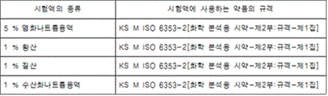제9조의2(침수시험) 면체는 0.25 m 및 0.8 m 깊이의 물속에 각각 5분간 침수시키는 경우, 기능에 이상이 생기지 아니하고 제7조 및 제9조의 기준에 적합하여야 한다.<개정 2024. 4. 19.> 제9조의3(복사열 저항성) 전면형면체를 별도1의 시험장치에 장착하고 안면부와 열원의 간격을 175 ㎜로 하여 (7.8 ∼ 8.0) ㎾/㎡의 복사열을 20분간 가하는 경우 급기호스ㆍ중압호스ㆍ공급밸브로 부터 면체로 공급되는 공기가 차단되지 아니하여야 하며, 제7조 및 제9조의 기준에 적합하여야 한다. 제9조의4(불꽃저항성 시험) ① 전면형 면체를 금속제 머리모형에 장착하고 별도 2와 같이 버너로부터 250 ㎜ 떨어진 상태로 설치하여 불꽃에 5초간 노출시키는 경우 안면부가 타지 아니하여야 한다. 이 경우 시험장치는 별도2 및 다음 각 호에 적합하여야 한다. 1. 별도2 시험장치의 6개 버너노즐에서 나오는 프로판 가스의 총 유량은 (21 ± 0.5) L/min일 것 2. 버너 끝으로 부터 250 ㎜ 높이의 불꽃온도는 (950 ± 50) ℃ 일 것 ② 제1항의 시험에서 면체에 부착되는 밸브나 음성전달판 등의 부품이 불꽃에 노출되지 아니한 경우에는 불꽃에 노출되지 않았던 부품을 불꽃에 노출되도록 하여 제1항의 시험을 다시 실시한다. 제10조(경보장치의 성능) 경보장치의 성능은 다음 각 호에 적합하여야 한다. 1. 음향경보장치는 무향실 조건을 갖추어 경보장치로부터 1 m 떨어진 위치에서 음압을 측정하는 경우, 90 ㏈ 이상이어야 한다. 이 경우 음향경보의 측정은 용기압력이 1 ㎫이 되는 시점까지로 한다. 2. 음향경보장치가 제1호에 적합한 경보를 하는 동안에 소모되는 공기량은 평균 5 L/min 이내이어야 한다. 3. 경보음의 주파수 대역은 2,000 ㎐ 내지 4,000 ㎐ 범위이어야 한다. 제11조(공기호흡기의 내열성) 공기호흡기는 (70 ± 2) ℃에서 6시간 놓아두어도 점착ㆍ균열 등이 생기지 아니하여야 한다. 다만, 용기 및 개폐밸브는 제외한다.<개정 2024. 4. 19.> 제12조(공기호흡기의 내한성) 공기호흡기는 (-20 ± 2) ℃에서 3시간 놓아두어도 균열ㆍ파손 등이 생기지 아니하여야 한다. 다만, 용기 및 개폐밸브는 제외한다.<개정 2024. 4. 19.> 제13조(면체의 내약품성) 면체는 다음표의 시험액(액온(22 ± 2) ℃) 중에 1시간 침지 후 꺼내어 (22 ± 2) ℃, 상대습도 95 % 이상의 공기 중에 24시간 놓아두어도 부식, 균열 등이 생기지 아니하여야 한다.