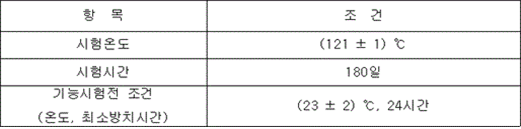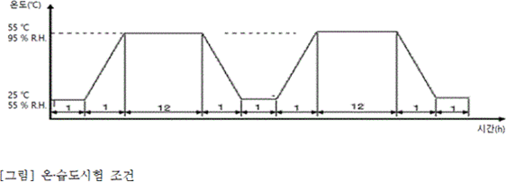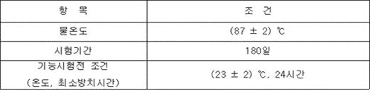 제1장 공통사항 제1조(목적) 이 기준은 「소방시설 설치 및 관리에 관한 법률」 제37조제5항에서 소방청장에게 위임한 유수제어밸브 형식승인 및 제품검사의 기술기준에 관한 사항을 규정함을 목적으로 한다. 제2조(정의) 이 기준에서 사용하는 용어의 정의는 다음과 같다. 1. "유수제어밸브"란 수계소화설비의 펌프 토출측에 사용되는 유수검지장치와 일제개방밸브를 말한다. 2. "1차측"이란 본체의 유입구에서 시트까지의 부분을 말한다. 3. "2차측"이란 시트에서부터 본체의 유출구까지의 부분을 말한다. 4. "습식유수검지장치"란 1차측 및 2차측에 가압수 또는 가압 포수용액(이하 "가압수 등"이라 한다)을 가득 채운상태에서 폐쇄형 스프링클러헤드 또는 일제개방밸브, 그 밖의 밸브(제5호에서는 "폐쇄형 스프링클러헤드 등"이라 한다)가 열린 경우 2차측의 압력저하로 시트가 열리어 가압수 등이 2차측으로 유출되도록 하는 장치를 말한다. 5. "건식유수검지장치"란 1차측에 가압수 등을 채우고 2차측에 공기 혹은 저압의 공기를 가득 채운상태에서 폐쇄형 스프링클러헤드 등이 열린 경우 2차측의 압력저하에 의하여 시트가 열리어 가압수등이 2차측으로 유출하는 장치를 말한다. 6. "준비작동식유수검지장치"란 1차측에 가압수 등을 채우고 2차측에 공기를 가득 채운상태에서 화재감지설비의 감지기ㆍ화재감지용 헤드, 그 밖의 감지를 위한 기기(이하 "감지부"라 한다)의 작동에 의하여 시트가 열리어 가압수 등이 2차측으로 유출하는 장치를 말한다. 7. "사용압력범위"란 유수제어밸브의 기능에 지장을 일으키지 아니하는 1차측의 압력범위를 말한다. 8. "최고사용압력"이란 유수제어밸브 내부에 허용되는 수압력범위 중 최고값을 말한다. 9. "압력설정값"이란 2차측에 압력의 설정을 필요로 하는 유수검지장치에서, 사용압력범위에 있어서의 1차측의 압력에 대응하는 2차측의 압력의 설정값을 말한다. 10. "제어동력"이란 밸브를 개방하기 위한 동력을 말한다. 11. "자동기동장치"란 유수제어밸브를 작동시키기 위해 전기적 신호에 따라 구동되는 전동밸브, 솔레노이드 밸브 등의 장치를 말한다. 제3조(재료) 유수제어밸브의 재료는 다음 각 호에 적합하여야 한다. 1. 밸브본체의 주요부분은 SPH-KFCA-D4301-5015(회주철품) 또는 SPH-KFCA-D4107-5010(고온 고압용 주강품)에 적합하거나 이와 동등이상의 강도 및 내식성이 있어야 하며, 이에 필요한 각 부품은 KS D 6024(구리 및 구리합금 주물)의 청동주물에 적합하거나 이와 동등이상의 강도 및 내식성이 있어야 한다. 2. 녹슬 염려가 있는 부분은 방청처리를 하여야 한다. 3. 합성수지ㆍ고무(실리콘 고무를 제외한다)는 KS M 6782(가황고무의 인장 시험방법)에 따라 시험하는 경우 인장강도는 15.2 ㎫ 이상, 연신율은 100 % 이상 이어야 한다. 4. 실리콘 고무는 KS M 6782(가황 고무의 인장 시험방법)에 따라 시험하는 경우 인장강도는 3.4 ㎫ 이상, 연신율은 100 % 이상 이어야 한다. 제3조의2(최고사용압력) 유수제어밸브의 최고사용압력은 1.2 ㎫ 이상이어야 한다. 제4조(압력손실시험) 유수제어밸브의 압력손실값(㎪)은 호칭크기의 압력배관용탄소강관(KS D 3562, 스케줄 40)에서 4.5 ㎧의 유속으로 방출하는 경우 20.7 kPa를 초과하지 아니하여야 한다. 제5조(본체강도시험) 호칭150이하인 유수제어밸브는 최고사용압력의 5배, 호칭 200이상의 유수제어밸브는 최고사용압력의 4배에 해당하는 수압력을 가하는 경우에 파괴되지 아니하고 1분 동안 견디어야 한다. 제5조의2(자동기동장치의 환경시험) 자동기동장치가 사용되는 경우에는 다음 시험을 순차적으로 실시한 후 최고사용압력에서 정격전압의 85 % 및 110 %를 가하는 경우 완전히 개폐되어야 한다. 1. 자동기동장치를 다음 각 목의 환경시험을 각각 30분 이내에 연속하여 실시하는 경우 외관상의 균열 및 변형 등이 없어야 한다. 가. 내열성시험: (85 ± 2) ℃의 항온조에 2시간 동안 방치시킨다. 나. 내한성시험: -(25 ± 3) ℃의 항온조에 2시간 동안 방치시킨다. 다. 온ㆍ습도시험: (25 ± 3) ℃, 상대습도 55 %에서 (55 ± 2) ℃, 상대습도 95 %이상으로 온ㆍ습도를 조정하여 그림과 같은 조건하에 방치시킨다. 제5조의3(자동기동장치의 반복시험) 자동기동장치가 사용되는 경우에는 최고사용압력 및 정격전압에서 20 000 사이클(분당 6사이클)동안 반복하여 완전 개방 및 완전 폐쇄시키는 경우 누수, 과도한 마모 및 파손 등의 결함이 없어야 한다. 제6조(표시) 유수제어밸브에는 다음 사항을 보기 쉬운 부위에 잘 지워지지 아니하도록 표시하여야 한다. 다만, 제14호 및 제15호는 포장 또는 취급설명서에 표시할 수 있다. 1. 종별 및 형식 2. 형식승인번호 3. 제조연월 및 제조번호 4. 제조업체명 또는 상호 5. 안지름, 사용압력범위 6. 유수 방향의 화살 표시 7. 설치방향 8. 2차측에 압력설정이 필요한 것에는 압력설정값 9. 검지유량상수(습식유수검지장치에 한한다.) 10. 습식유수검지장치에 있어서는 최저사용압력에 있어서 부작동 유량 11. 일제개방밸브 개방용 제어부의 사용압력범위(제어동력에 1차측의 압력과 다른 압력을 사용하는 것에 한한다) 12. 일제개방밸브 제어동력에 사용하는 유체