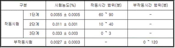 제17조(장기성능시험) 가스누설경보기는 전류를 통한 상태 및 전류를 통하지 아니한 상태에서 각각 60일간 방치하여 제16조의 경보농도시험 및 제19조의 잡가스시험을 실시하는 경우 기능에 이상이 생기지 아니하여야 한다. 다만, 일산화탄소경보기는 잡가스시험을 실시하지 아니한다. (개정 2024. 12. 30.) 제18조(전원전압변동시험) 사용전원전압 ±20 %인 전압에서 각각 제16조의 경보농도시험을 하는 경우 기능에 이상이 생기지 아니하여야 한다. (개정 2024. 12. 30.) 제19조(잡가스시험) ① 가스누설경보기(일산화탄소경보기는 제외한다)는 1시간이상 전류를 통하게 하여 안정시킨 후 다음 각호의 시험을 실시하는 경우 작동하지 아니하여야 한다. 1. 가스누설경보기는 에칠알코올가스의 농도가 0.1 %인 상태에서 5분간 투입하는 시험 2. 가스누설경보기는 「감지기의 형식승인 및 제품검사의 기술기준」 제19조에 따른 광전식감지기 2종의 작동시험 시의 연기농도에 5분간 투입하는 시험 ② 일산화탄소경보기는 1시간이상 전류를 통하게 하여 안정시킨 후 다음 표의 시험농도에 해당하는 시험가스를 시험시간 동안 투입하는 경우 작동하지 아니하여야 하며 기능에 이상이 생기지 아니하여야 한다. 제20조(진동시험) ① 가스누설경보기(분리형가스누설경보기의 경우에는 탐지부를 포함한다. 제2항에서 같다)는 전원이 인가된 상태에서 IEC 60068-2-6의 시험방법에 따라 다음 각호의 규정에 의한 시험을 실시하는 경우 시험중 잘못 작동되거나 시험후 구조 및 기능에 이상이 없어야 한다. 1. 주파수 범위 : (10 ∼ 150) ㎐ 2. 가속도 진폭 : 0.981 m/s2 3. 축수 : 3 4. 스위프 속도 : 1 옥타브/min 5. 스위프 사이클 수 : 축 당 1 ② 가스누설경보기는 전원을 인가하지 않은 상태에서 IEC 60068-2-6의 시험방법에 따라 다음 각호의 규정에 의한 시험을 실시하는 경우 구조 및 기능에 이상이 없어야 한다. 1. 주파수 범위 : (10 ∼ 150) ㎐ 2. 가속도 진폭 : 4.905 m/s2 3. 축수 : 3 4. 스위프 속도 : 1 옥타브/min 5. 스위프 사이클 수 : 축 당 20 제21조(온도시험) 가스누설경보기(분리형가스누설경보기는 탐지부를 말한다. 제23조, 제25조 및 제26조에서 같다)는 다음 각호의 시험을 실시하였을 때 기능에 이상이 생기지 아니하여야 한다. 다만, 다음에서 정하는 온도보다 강화하여 제조자가 요청시는 그 온도로 시험할 수 있다. 1. 통전상태로 내부온도가 - (20 ± 2) ℃ 및 (55 ± 2) ℃인 항온기에 각각 1시간 이상 놓아둔 다음 각각의 온도에서 제16조의 시험 (개정 2024. 12. 30.) 2. 흡입식탐지부는 온도가 - (20 ± 2) ℃의 항온기에 24시간 방치하고, 다시 (55 ± 2) ℃인 항온기내에 24시간 방치하는 것을 1사이클로 하여 연속 3사이클을 반복한 후 1시간 안정시킨 다음 제16조의 시험 (개정 2024. 12. 30.) 제22조(습도시험) ① 경보기는 주위온도 (40 ± 2) ℃, 상대습도 (93 ± 3) %인 조건에서 전원을 인가한 상태로 4일간 방치하는 경우 잘못 작동하지 아니하여야 하며 구조 및 기능에 이상이 없어야 한다. (개정 2024. 12. 30.) ② 경보기는 (40 ± 2) ℃, 상대습도 (93 ± 3) %인 조건에서 전원을 인가하지 않은 상태로 21일간 방치하는 경우 구조 및 기능에 이상이 없어야 한다. (신설 2024. 12. 30.) 제23조(방폭성능시험) ① 가스의 누설을 탐지하는 탐지소자는 STS 316 또는 이와 동등이상의 스테인레스 강선인 100메쉬의 금속망을 밀착시켜 사용하되, 망의 구멍(가스가 통과하는 면적)이 넓혀져 있거나 변형 등이 없어야 하며, 분리형가스누설경보기에 있어서는 탐지소자를 스트레이너로 보호하여야 한다. (개정 2024. 12. 30.) ② 가스누설경보기를 다음표중 시험가스농도가 A인 상태에서 7시간 연속하여 울리게 한 다음 계속하여 시험가스농도를 B로 하여 1시간 동안 전류를 통하는 경우(1초간 2회 전원을 중단한다) 가스누설경보기(제4조제5호의 규정에 의한 방폭구조에 적합한 것은 제외한다)는 다음 각 호에 적합하여야 한다. 이 경우 시험가스는 이소부탄가스를 원칙으로 하며 탐지대상가스의 주성분에 따라 메탄 또는 수소가스를 시험가스로 할 수 있다.