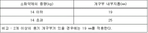 제1조(목적) 이 기준은「소방시설 설치 및 관리에 관한 법률」제37조제5항에서 소방청장에게 위임한 소화기의 형식승인 및 제품검사의 기술기준에 관한 사항을 규정함을 목적으로 한다.<개정 2016. 10. 4.> 제2조(용어의 정의) 이 기준에서 사용하는 용어의 정의는 다음과 같다. 1. "소화기"란 물이나 소화약제를 압력에 의하여 방사하는 기구로서 사람이 조작하여 소화하는 것(소화약제에 의한 간이소화용구를 제외한다)을 말한다.<개정 2012. 2. 9.> 2. "가압식 소화기"란 소화약제의 방출원이 되는 가압가스를 소화기 본체용기(이하 "용기"라 한다)와는 별도의 전용용기(이하 "가압용가스용기"라 한다)에 충전하여 장치하고 가압용가스용기의 작동봉판을 파괴하는 등의 조작에 의하여 방출되는 가스의 압력으로 소화약제를 방사하는 방식의 소화기를 말한다.<개정 2024. 7. 25.> 3. "축압식 소화기"란 용기 중에 소화약제와 함께 소화약제의 방출원이 되는 질소 등의 압축가스를 봉입한 방식의 소화기를 말한다.<개정 2024. 7. 25.> 4. "소화약제"란 방염성능이 있는 물질을 가공하여 소화에 사용하는 약제 또는 물을 말한다. 5. "대형소화기"란 제4조제2항 및 제10조에 해당하는 소화기를 말한다.<개정 2013. 7. 25.> 6. "소형소화기"란 제5호에서 규정하는 이외의 소화기를 말한다. 7. "멜빵식 소화기"란 멜빵 등을 이용하여 소화기 본체를 등에 지고 사용하는 형태의 소화기를 말한다. 8. "차륜식 소화기"란 바퀴가 달린 차대(車臺) 등에 소화기 본체가 장착되어 끌어서 이동하는 형태의 소화기를 말한다. 제3조(일반구조) 소화기의 일반 구조는 다음 각 호에 적합하여야 한다. 1. 작동방식이 확실하고 취급ㆍ 점검 및 정비가 용이하여야 한다. 2. 소화기는 한사람이 쉽게 사용할 수 있어야 하며 조작 시 인체에 부상을 유발하지 아니하는 구조이어야 한다. 3. 소화기에 충전하는 소화약제는 소화약제의 중량을 100 g 단위로 구분하여야 한다. 4. 축압식 소화기는 지시압력계를 설치하여야 한다. 다만 이산화탄소 및 할론1301 등 자체 증기압으로 방사되는 구조의 소화기는 제외할 수 있다.<개정 2024. 7. 25.> 5. 지시압력계는 충전압력값이 소화기의 축심과 일직선상에 위치하도록 부착하여야 한다. 6. 소화기 용기의 외부에 부착하는 가압용가스용기는 외부의 충격으로부터 보호될 수 있는 구조이어야 한다.<개정 2024. 7. 25.> 7. 소화기는 손상, 변형 및 가공불량 등이 없어야 하며 각 부 치수의 허용공차는 KS B 0250(주조품-치수공차 및 절삭여유방식), KS B ISO 2768-1(일반 공차 - 제1부 : 개별 공차 지시가 없는 선 치수와 각도 치수에 대한 공차) 및 KS B 0413(판재의 프레스 가공품 일반 치수 공차)을 준용하여야 한다.<개정 2024. 7. 25.> 8. 소화기 총중량은 설계값의 (-2 ∼ 5) % 이어야 한다. 다만, 이음매 없는 강제용기를 사용하는 경우에는 설계값의 (-5 ∼ 15) % 이어야 한다.<개정 2012. 2. 9.> 9. 소화기 용기 하단에 설치되는 밑받침은 용접 또는 체결 등의 방법으로 설치하여야 하며 별도의 조작 없이 빠지지 아니하는 구조이어야 한다.<개정 2024. 7. 25.> 10. 소화기의 주 기능에 영향을 미치는 부속장치를 설치하지 아니하여야 한다. 11. <삭제 2024. 7. 25.> 12. <삭제 2019. 9. 24.> 13. 휴대식 소화기는 별도의 지지대 없이 바로 세워질 수 있어야 하고 벽에 걸 수 있는 구조(「고압가스 안전관리법」의 적용을 받는 소화기는 제외할 수 있다)이어야 한다.<신설 2024. 7. 25.> 14. 용기 개구부의 내부지름은 다음 표에서 정하는 크기 이상이어야 한다. <신설 2024. 7. 25.> 15. 소화기의 표면은 녹슬지 아니하도록 칠을 하여야 한다. 다만. 내식성 재료로된 소화기는 제외할 수 있다.<신설 2024. 7. 25.> 제4조(능력단위 등) ① A급 화재용 소화기 또는 B급 화재용 소화기는 별표 2 또는 별표 3에 따라 측정하는 경우 능력단위의 수치가 1이상이어야 한다.<개정 2012. 2. 9.> ② 대형소화기의 능력단위의 수치는 A급 화재에 사용하는 소화기는 10단위이상, B급 화재에 사용하는 소화기는 20단위이상이어야 한다. ③ C급 화재용 소화기는 제1항의 규정 및 제8조제3항제10호의 절연내력시험 또는 별표4의 전기전도성시험에 적합하여야 하며 C급 화재에 대한 능력단위는 지정하지 아니한다.<개정 2012. 2. 9., 2015. 3. 19., 2024. 7. 25.> ④ K급화재용 소화기는 제1항의 규정 및 별표 6의 K급화재용 소화기의 소화성능시험에 적합하여야 하며, K급화재에 대한 능력단위는 지정하지 아니한다.<개정 2016. 10. 4.> ⑤ D급화재용 소화기는 별표 7의 D급 화재용 소화기의 소화성능시험 중 신청된 금속을 대상으로 소화성능시험에 적합하여야 하며, D급화재에 대한 능력단위는 지정하지 아니한다.<신설 2024. 7. 25. 개정 2025. 00. 00.> 제5조(합성수지 노화시험) 소화기에 사용되는 주요부품이 합성수지재질인 경우에는 다음 각 호의 시험을 하는 경우에 변형 또는 균열 등이 생기지 아니하여야 하며 노화시험 후 성능 및 기능에 이상이 생기지 아니하여야 한다. 다만 소화약제와 상시 접촉하지 않는 부품의 경우에는 제2호의 시험을 생략한다.<개정 2012. 2. 9., 2024. 7. 25.> 1. 공기가열노화시험 (100 ± 5) ℃에서 180일 동안 가열 노화시킨다. 다만, 100 ℃의 온도에서 