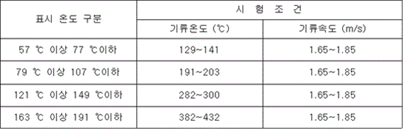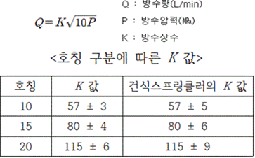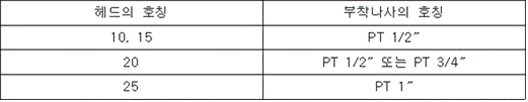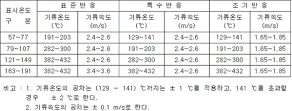 제1장 공통사항 제1조(목적) 이 기준은 「소방시설 설치 및 관리에 관한 법률」 제37조제5항에서 소방청장에게 위임한 스프링클러헤드의 형식승인 및 제품검사의 기술기준에 관한 사항을 규정함을 목적으로 한다.<개정 2013. 7. 25., 2015. 1. 15., 2017. 12. 28.> 제2조(용어의 정의) 이 기준에서 사용하는 용어의 정의는 다음과 같다. 1. "스프링클러헤드"란 화재 시 가압된 물이 내뿜어져 분산됨으로써 소화기능을 하는 헤드를 말한다. 2. "폐쇄형스프링클러헤드"란 정상상태에서 방수구(放水口)를 막고 있는 감열체가 일정온도에서 자동적으로 파괴ㆍ용해 또는 이탈됨으로써 방수구가 개방되는 스프링클러헤드를 말한다. 3. "개방형스프링클러헤드"란 감열체 없이 방수구가 항상 열려 있는 스프링클러헤드를 말한다. 4. <삭제> 5. "측벽형스프링클러헤드"란 가압된 물이 분사될 때 축심을 중심으로 한 반원상에 균일하게 분산시키는 헤드를 말한다. 6. "반사판"이란 스프링클러헤드의 방수구에서 유출되는 물을 세분시키는 작용을 하는 것을 말한다. 7. "프레임(frame)"이란 스프링클러헤드의 나사부분과 반사판을 연결하는 이음쇠 부분을 말한다. 8. "감열체"란 정상상태에서는 방수구를 막고 있으나 열에 의하여 일정한 온도에 도달하면 스스로 파괴ㆍ용해되어 헤드로부터 이탈됨으로써 방수구가 열려 스프링클러헤드가 작동되도록 하는 부분을 말한다. 9. "퓨지블링크(fusible link)"란 감열체 중 이융성금속으로 융착되거나 이융성물질에 의하여 조립된 것을 말한다. 10. "유리벌브"란 감열체 중 유리구 안에 액체 등을 넣어 봉한 것을 말한다. 11. "표시온도"란 폐쇄형스프링클러헤드에서 감열체가 작동하는 온도로서 미리 헤드에 표시한 온도를 말한다. 12. "최고주위온도"란 폐쇄형스프링클러헤드의 설치장소에 관한 기준이 되는 온도로서 다음 식에 의하여 구하여진 온도를 말한다. 다만, 헤드의 표시온도가 섭씨 75도 미만인 경우의 최고주위온도는 다음 등식에 불구하고 섭씨 39도로 한다. 13. "설계하중"이란 폐쇄형스프링클러헤드에서 방수구를 막고 있는 감열체가 정상상태에서 이탈하지 못하게 하기 위하여 헤드를 조립할 때 헤드에 가하여지도록 미리 설계된 하중을 말한다. 14. "방수압력"이란 별도 1의 정류통에 의하여 측정한 방수시의 정압을 말한다. 15. "화재조기진압용스프링클러헤드"란 특정 높은 장소의 화재위험에 대하여 조기에 진화할 수 있도록 설계된 스프링클러헤드를 말한다. 16. "건식스프링클러헤드"란 물과 오리피스가 배관에 의해 분리되어 동파를 방지할 수 있는 스프링클러헤드를 말한다. 17. 삭제 <2016. 4. 1.> 18. 삭제 <2016. 4. 1.> 19. 삭제 <2016. 4. 1.> 20. <삭제> 21. "반응시간지수(response time index: RTI)"란 기류의 온도ㆍ속도 및 작동시간에 대하여 스프링클러헤드의 반응을 예상한 지수로서 아래 식에 의하여 계산하고(mㆍs) 0.5를 단위로 한다. 22. "표준방향"이란 대칭 감열체인 경우에는 공기의 흐름이 유수방향과 프레임의 평면이 서로 직각이 되는 방향을, 비대칭 감열체인 경우에는 공기의 흐름이 유수방향과 반응시간이 가장 짧게 소요되는 프레임의 평면과 직각을 이루는 방향(별도 7 참조)을 말한다. 23. "최악의 방향"이란 공기의 흐름과 유수방향이 서로 수평이 되도록 설치되어 감열체와 기류의 접촉이 부속품에 의해 방해되게 설치되어 반응시간지수가 가장 큰 방향(별도 7 참조)을 말한다. 24. "주거형스프링클러헤드"란 폐쇄형헤드의 일종으로 주거지역의 화재에 적합한 감도ㆍ방수량 및 살수분포를 갖는 헤드를(간이형스프링클러헤드를 포함한다) 말한다. 25. "라지드롭형(large-drop type) 스프링클러헤드"란 동일 조건의 수압력에서 큰 물방울을 방출하여 화염의 전파속도가 빠르고 발열량이 큰 저장창고 등에서 발생하는 대형화재를 진압할 수 있는 헤드를 말한다. 26. <삭제> 27. "표준반응, 특수반응, 조기반응"이란 스프링클러헤드의 감도를 반응시간지수에 따라 구분한 것을 말한다. 28. "윈도우 스프링클러헤드"는 실내화재로부터 외벽에 설치된 유리창을 보호하기 위해 설치하는 헤드를 말한다.<신설 2024. 8. 28.> 제3조(구조) ① 스프링클러헤드(이하 "헤드"라 한다)의 구조는 다음 각 호에 적합하여야 한다. 1. 배관에 부착하는 등 취급할 때 기능에 영향을 미치는 손상 또는 이상이 생기지 않아야 한다. 2. 작동 시에 분해되는 모든 부분은 물의 분사를 방해하지 않도록 분해되고 떨어져 나가야 한다. 3. 조립된 헤드의 각 부분에 가하여지는 하중을 임의로 조작할 수 없도록 조치되어야 한다. 4. 물속의 이물질(배관내의 물때ㆍ모래ㆍ진흙 등을 말한다)이나 공기 중의 먼지ㆍ기름ㆍ증기ㆍ분진 등의 부유물에 의하여 기능에 이상이 생기지 않는 구조이어야 한다. ② 헤드의 부착나사는 KS B 0222(관용 테이퍼 나사)중 다음 표의 헤드 구분에 따른 부착나사 또는 이에 상당하는 호칭 이상의 관용 테이퍼 나사이어야 하며, 보관ㆍ운반 등의 경우 손상되지 않도록 적합한 보호장치를 하여야 한다. ③ 차폐판을 부착하는 헤드는 차폐판의 끝부근에서 감열체의 밑부분을 연결하는 선의 보호각은 45도 이하이어야 한다.<신설 1997. 12. 6.> 