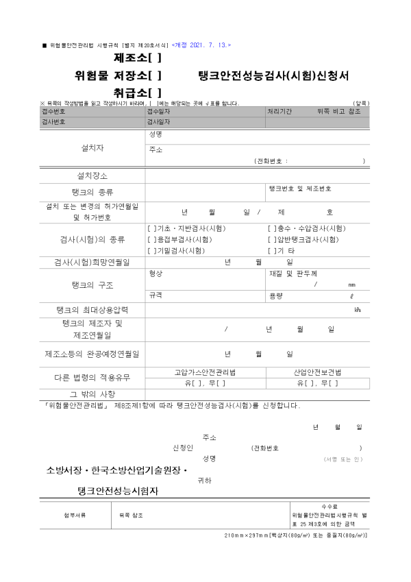 위험물 | [위험물] 위험물(제조소, 저장소, 취급소)탱크안전성능검사(시험)신청서