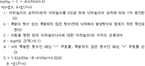 제1장 총칙 제1조(목적) 이 고시는「위험물안전관리법 시행령」,「위험물안전관리법 시행규칙」및「기업활동 규제완화에 관한 특별조치법」제52조제2항에 따라 위임된 사항과「위험물안전관리법」을 운용하기 위하여 필요한 세부기준을 규정함을 목적으로 한다. 제2장 위험물의 시험 및 판정 제2조(산화성고체의 시험방법 및 판정기준) 「위험물안전관리법 시행령」(이하 "영"이라 한다) 별표 1 비고 제1호의 규정에 따른 산화성고체에 해당하는 산화성의 시험방법 및 판정기준은 제3조 및 제4조의 규정에 의하며, 충격에 대한 민감성의 시험방법 및 판정기준은 제5조 및 제6조의 규정에 따른다. 제3조(산화성 시험방법) ① 분립상(매분당 160회의 타진을 받으며 회전하는 2㎜의 체를 30분에 걸쳐 통과하는 양이 10중량% 이상인 것을 말한다. 이하 같다) 물품의 산화성으로 인한 위험성의 정도를 판단하기 위한 시험은 연소시험으로 하며 다음 각 호에 의한다. 1. 표준물질의 연소시험 가. 표준물질(시험에 있어서 기준을 정하는 물질을 말한다. 이하 같다)로서 150㎛ 이상 300㎛ 미만(입자의 크기의 측정방법은 매분당 160회의 타진을 받으며 30분간 회전하는 해당 규격의 체를 통과하는지 여부를 확인하여 행한다. 이하 같다)인 과염소산칼륨과 250㎛ 이상 500㎛ 미만인 목분(木粉)을 중량비 1:1로 섞어 혼합물 30g을 만들 것 나. 혼합물을 온도 20℃, 1기압의 실내에서 높이와 바닥면의 직경비가 1:1.75가 되도록 원추형으로 무기질의 단열판 위에 쌓고 직경 2㎜의 원형 니크롬선에 통전(通電)하여 온도 1,000℃로 가열 된 것을 점화원으로 하여 원추형 혼합물의 아랫부분에 착화할 때까지 접촉할 것 다. 착화부터 불꽃이 없어지기까지의 시간을 측정할 것 라. 가목 내지 다목의 시험을 5회 이상 반복하여 평균연소시간을 구할 것 2. 시험물품의 연소시험 가. 시험물품(시험을 하고자 하는 물품을 말한다. 이하 같다)을 직경 1.18㎜ 미만으로 부순 것과 250㎛ 이상 500㎛ 미만인 목분을 중량비 1:1 및 중량비 4:1로 섞어 혼합물 30g을 각각 만들 것 나. 두 혼합물을 제1호나목 내지 라목의 방법에 의하여 각각 평균연소시간을 구한 다음, 둘 중 짧은 연소시간을 택할 것 ② 분립상 외의 물품의 산화성으로 인한 위험성의 정도를 판단하기 위한 시험은 대량연소시험으로 하며 그 방법은 다음 각 호에 의한다. 1. 표준물질의 대량연소시험 가. 표준물질로서 150㎛ 이상 300㎛ 미만인 과염소산칼륨과 250㎛ 이상 500㎛ 미만인 목분을 중량비 4:6으로 섞어 혼합물 500g을 만들 것 나. 혼합물을 온도 20℃, 1기압의 실내에서 높이와 바닥면의 직경비가 1:2가 되도록 원추형으로 무기질의 단열판 위에 쌓고 점화원으로 원추형 혼합물의 아랫부분에 착화할 때까지 접촉할 것 다. 제1항제1호다목 및 라목에 의할 것 2. 시험물품의 대량연소시험 가. 시험물품과 250㎛ 이상 500㎛ 미만인 목분을 체적비 1:1로 섞어 혼합물 500g을 만들 것 나. 제1호나목 및 다목에 의할 것 제4조(산화성 판정기준) 산화성으로 인하여 산화성고체에 해당하는 것은 다음 각 호와 같다. 1. 분립상 물품에 있어서는 제3조제1항제2호의 시험에 의한 연소시간이 동항제1호의 시험에 의한 연소시간 이하인 것 2. 분립상 외의 물품에 있어서는 제3조제2항제2호의 시험에 의한 연소시간이 동항제1호의 시험에 의한 연소시간 이하인 것 제5조(충격민감성 시험방법) ① 분립상 물품의 민감성으로 인한 위험성의 정도를 판단하기 위한 시험은 낙구타격감도시험으로 하며 그 방법은 다음 각 호에 의한다. 1. 표준물질의 낙구타격감도시험 가. 온도 20℃, 1기압의 실내에서 직경 및 높이 12㎜의 강제(鋼製) 원기둥 위에 적린(180㎛ 미만인 것. 이하 같다) 5㎎을 쌓고 그 위에 표준물질로서 질산칼륨(150㎛ 이상 300㎛ 미만인 것. 이하 같다) 5㎎을 쌓은 후 직경 40㎜의 쇠구슬을 10㎝의 높이에서 혼합물의 위에 직접 낙하시켜 발화 여부를 관찰할 것. 이 경우에 폭발음, 불꽃 또는 연기를 발생하는 경우에는 폭발한 것으로 본다. 나. 가목에 의한 결과 폭발한 경우에는 낙하높이(H, 강제의 원기둥의 상면에서 강구의 하단까지의 높이)를 당해 낙하높이의 상용대수(logH)와 비교하여 상용대수의 차가 0.1이 되는 높이로 낮추고, 폭발하지 않는 경우에는 낙하높이를 당해 낙하높이의 상용대수와 비교하여 상용대수의 차가 0.1이 되는 높이로 높이는 방법(Up-down법)에 의하여 연속 40회 이상(최초로 폭발될 때부터 폭발되지 않을 때 또는 폭발되지 않을 때부터 폭발이 될 때까지의 횟수) 반복하여 강구를 낙하시켜 폭점산출법으로 표준물질과 적린과의 혼합물의 50% 폭점(폭발확률이 50%가 되는 낙하높이를 말한다. 이하 같다)을 구할 것. 다만, 낙하높이의 상용대수의 표준편차가 0.05에서 0.2까지의 범위 내에 있지 않는 경우에는 시험을 반복한다. 다. 50% 폭점(H50, 단위 cm) 및 상용대수의 표준편차(S)는 다음 식으로 산출할 것 2. 시험물품의 낙구타격감도시험 가. 시험물품을 직경 1.18㎜ 미만으로 부순 것을 제1호가목에 의하여 시험을 10회 실시할 것. 이 경우 제1호나목에서 구한 50% 폭점을 낙하높이로 한다. 나. 가목에 의한 시험결과 폭발하는 경우 