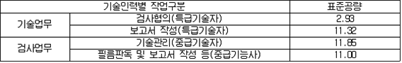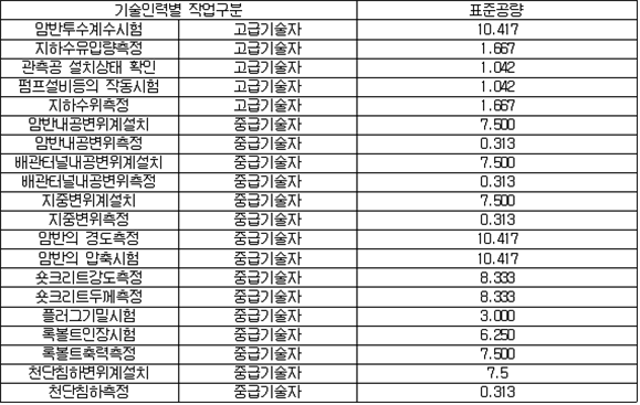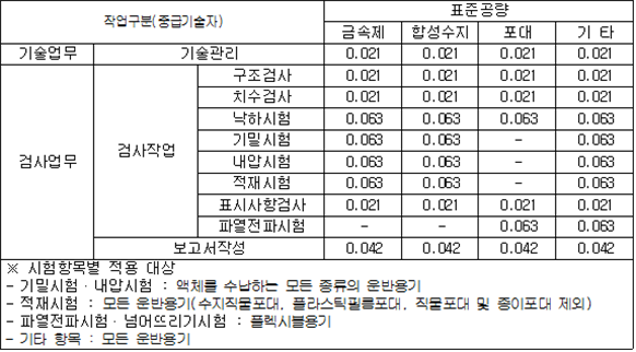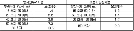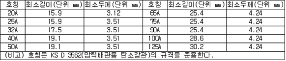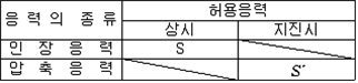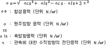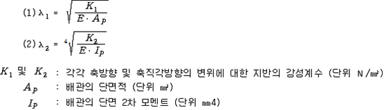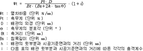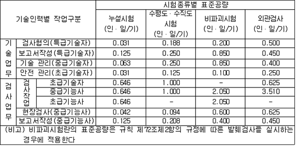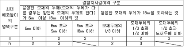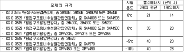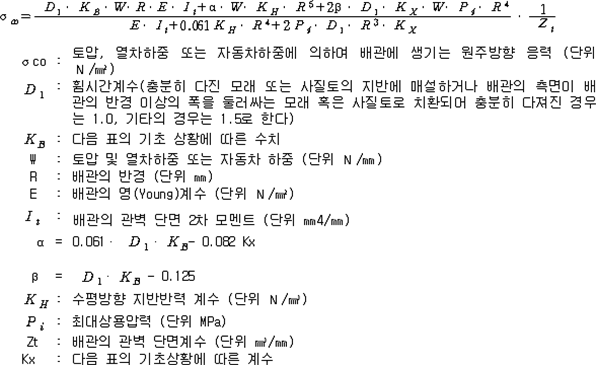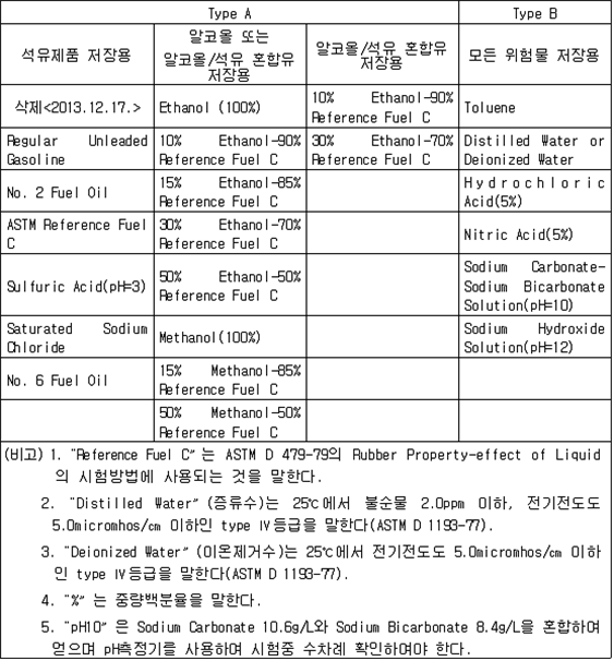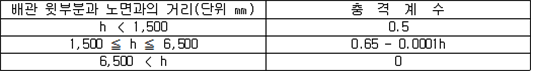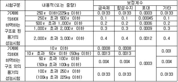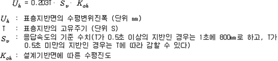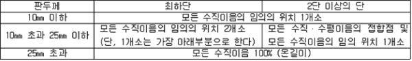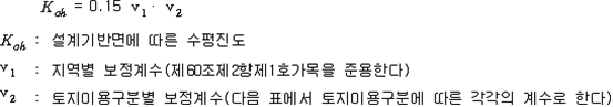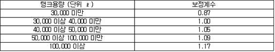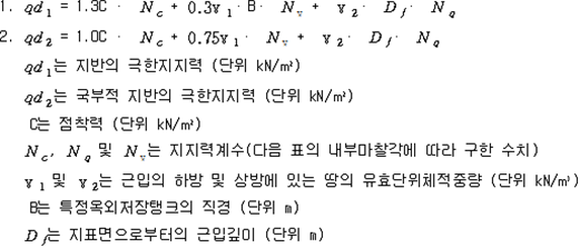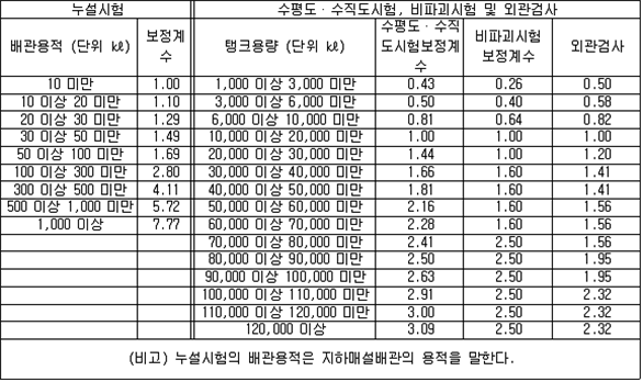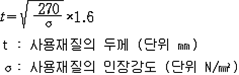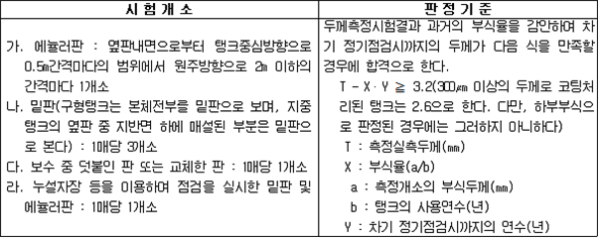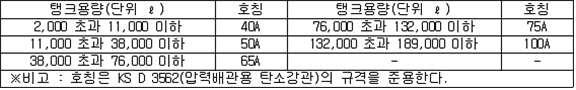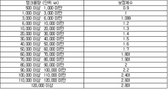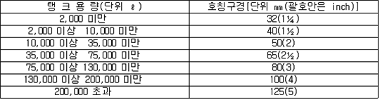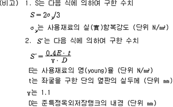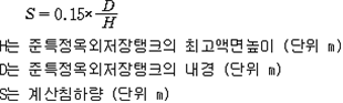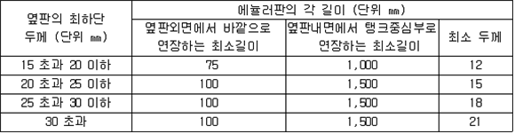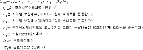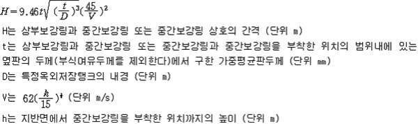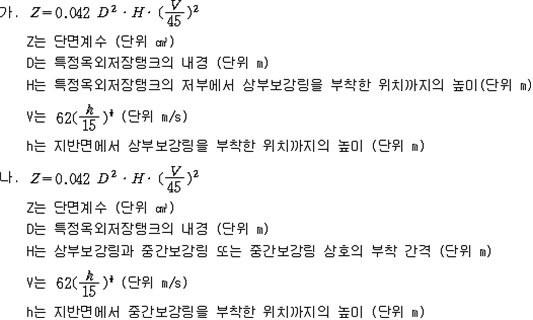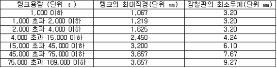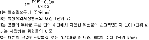 2. 필요보유수평내력은 다음 식에 의할 것 제57조(특정옥외저장탱크의 옆판등의 최소두께 등) 규칙 별표 6 Ⅶ제2호다목의 규정에 따른 옆판, 밑판 및 지붕의 최소두께와 에뉼러판의 너비 및 최소두께는 다음 각 호와 같다. 1. 옆판의 최소두께는 다음 표에 의할 것 2. 밑판의 최소두께는 특정옥외저장탱크의 용량이 1,000㎘ 이상 10,000㎘ 미만의 것에 있어서는 8㎜로 하고, 10,000㎘ 이상의 것에 있어서는 9㎜로 할 것. 다만, 저장하는 위험물의 성상 등에 따라 밑판이 부식할 우려가 없다고 인정되는 경우에는 당해 밑판의 두께를 감소할 수 있다. 3. 지붕의 최소 두께는 4.5㎜로 할 것 4. 에뉼러판의 옆판외면에서 바깥으로 연장하는 최소길이, 옆판내면에서 탱크중심부로 연장하는 최소길이 및 최소두께는 다음 표에 의할 것 제58조(특정옥외저장탱크의 주하중 및 종하중) 특정옥외저장탱크에 관계된 주하중 및 종하중(제59조 및 제60조에 정한 것은 제외한다)의 계산방법은 다음 각 호에 의한다. 1. 특정옥외저장탱크의 자중은 당해 특정옥외저장탱크의 강재의 비중을 7.85로 계산할 것 2. 저장하는 위험물의 중량에 있어서는 당해 저장하는 위험물의 비중이 1.0에 달하지 아니하는 때는 당해 비중을 1.0으로 계산할 것 3. 온도변화의 영향은 저장하는 위험물의 최고액체온도와 당해 특정옥외저장탱크을 설치한 지역의 연간 평균기온과의 차이로 계산하고, 4. 적설하중은 적설량이 1㎡당 1㎝에 19.6N 이상으로 계산할 것 제59조(특정옥외저장탱크의 풍하중 등) ① 특정옥외저장탱크에 관계된 풍하중의 계산방법은 다음 각 호에 의한다 1. 1㎡당 풍하중은 다음 식에 의할 것 2. 제1호의 규정에 불구하고 다음 각목의 규정에 따른 경우에는 해당 각목에 정한 것에 의할 것 가. 해안, 하안, 산지 등 강풍을 받는 우려가 있는 장소에 설치하는 탱크의 풍하중 : 1㎡당 2.05kN 나. 원통형탱크로서 지반면으로부터의 높이가 25m 이상인 것의 풍하중 : 1㎡당 2.05kN 다. 원통형탱크 외의 탱크로서 지반면으로부터의 높이가 25m 이상인 것의 풍하중 : 1㎡당 2.94kN ② 특정옥외저장탱크에 보강링(windguard)을 설치하는 경우에는 단면계수등의 계산방법은 다음 각 호에 의한다. 1. 보강링의 필요단면계수는 특정옥외저장탱크의 옆판의 최상부에 설치하는 것(이하 "상부보강링"이라 한다)에 있어서는 가목의 식에 의하여, 상부보강링 외의 것(이하??중간보강링"이라 한다)에 있어서는 나목의 식에 의하여 구한 수치에서 설계에 관계된 상부보강링 또는 중간보강링의 형상을 고려하여 제2호에 의하여 구한 단면계수의 수치를 뺀 수치를 초과하는 수치로 할 것 2. 제1호에 의하여 빼야할 단면계수의 수치는 다음 각목에 의할 것 가. 상부보강링에 있어서는 당해 상부보강링의 부착 폭에 당해 상부보강링을 부착한 위치의 상방 및 하방으로 각각 옆판 두께의 16배에 상당하는 수치를 더한 수치(상부보강링의 부착위치에서 옆판의 최상단까지의 간격이 당해 옆판 두께의 16배 미만인 경우는 당해 부착폭에 당해 간격과 당해 상부보강링을 부착한 위치의 하단으로 옆판 두께의 16배에 상당하는 수치를 더한 수치)를 폭으로 하는 옆판의 판두께 방향의 단면계수의 수치 나. 중간보강링에 있어서는 당해 중간보강링 부착 폭에 당해 중간보강링을 부착한 위치의 상방 및 하방으로 다음 식에 의하여 구한 수치를 더한 수치를 폭으로 하는 옆판의 판두께 방향의 단면계수의 수치 3. 중간보강링의 설치위치는 다음 식에 의할 것 제60조(특정옥외저장탱크의 지진의 영향) ① 특정옥외저장탱크에 관계된 지진의 영향은 다음 각 호에 규정한 지진동(地震動)에 의한 관성력 등에 의하여 발생하는 영향을 말한다 1. 수평방향 및 수직방향 지진동에 의한 탱크본체 관성력 2. 수평방향 및 수직방향 지진동에 의한 옆판부에 작용하는 동액압(動液壓) 3. 수평방향 지진동에 의한 저부수평력 4. 수평방향 지진동에 의한 옆판부의 모멘트 5. 수평방향 지진동에 의한 밑판부의 모멘트 6. 액면요동(液面搖動)에 의한 옆판부에 작용하는 동액압(動液壓) 7. 액면요동에 의한 저부수평력 8. 액면요동에 의한 옆판부의 모멘트 9. 액면요동에 의한 밑판부의 모멘트 ② 지진 영향에 관한 특정옥외저장탱크의 설계진도 계산방법은 다음 각 호에 의한다. 1. 설계수평진도는 다음 식에 의할 것 가. 지역별보정계수 나. 지반별보정계수 다. 특정옥외저장탱크의 고유주기에 따른 응답배율 (비고) 특정옥외저장탱크의 고유주기의 계산방법은 다음 식에 의할 것 2. 설계수직진도는 설계수평진도의 30% 이상으로 할 것 3. 액면요동의 설계수평진도는 다음 식에 의할 것 제61조(특정옥외저장탱크의 옆판의 두께 계산방법) 특정옥외저장탱크의 옆판두께는 다음 식에 의하여 구한 수치(옆판 최하단에 있어서는 당해 수치에 1.18을 곱한 수치)에 부식여유두께를 더한 수치로 한다. 제62조(특정옥외저장탱크의 용접시공방법확인시험의 방법 등) ① 규칙 별표 6 Ⅶ제3호 후단의 규정에 따른 특정옥외저장탱크의 용접시공방법확인시험의 방법은 다음 각 호와 같다 1. 용접시공방법확인시험은 특정옥외저장탱크에 사용된 강판, 당해 탱크의 