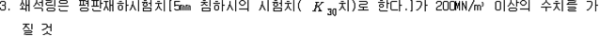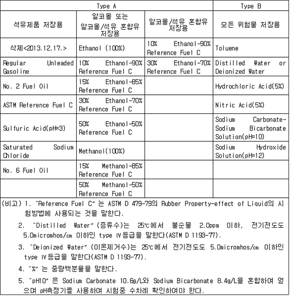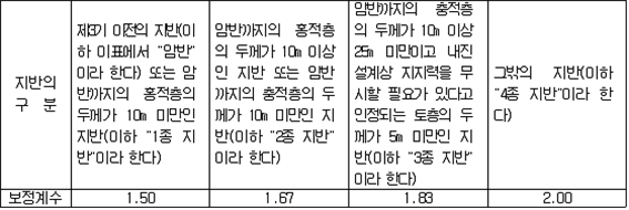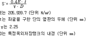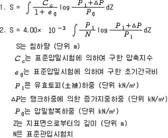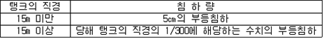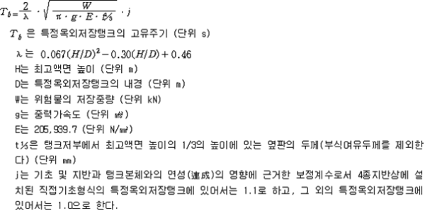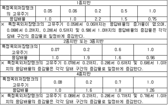 제73조(준특정옥외저장탱크의 보유수평내력등의 계산방법) 규칙 별표 6 Ⅷ제3호의 규정에 따른 보유수평내력 및 필요보유수평내력의 계산방법은 제56조를 준용한다. 제74조(옥외저장탱크의 지진동에 의한 관성력 및 풍하중의 계산방법) 규칙 별표 6 Ⅵ제3호나목의 규정에 따른 지진동에 의한 관성력 및 풍하중의 계산방법은 다음 각 호와 같다. 1. 지진동에 의한 관성력은 탱크의 자중과 당해 탱크에 저장하는 위험물의 중량의 합에 설계수평진도를 곱하여 구할 것. 이 경우에 설계수평진도는 다음 식에 의하여 구한다. 2. 풍하중은 제59조제1항에 의할 것 제75조(지중탱크의 설치장소의 제한) 규칙 별표 6 ⅩⅡ제2호가목의 규정에 따른 장소는 다음 각 호와 같다. 1. 「수도법」에 의한 수도시설(위험물의 유입의 우려가 있는 것에 한한다)로부터 수평거리 300m의 범위내의 장소 2. 지하철, 지하터널 또는 지하가 기타 지하공작물(당해 지중탱크에 관계된 갱도 등의 지하공작물을 제외한다)로부터 수평거리가 지중탱크 수평단면의 내경의 1/2 또는 지중탱크 밑판의 윗면에서 지반면까지의 탱크 높이 중 큰 것과 같은 거리의 범위내의 장소 제76조(지중탱크의 지반의 범위) 규칙 별표 6 ⅩⅡ제2호라목2)나)의 규정에 따른 지반의 범위는 다음 각 호와 같다. 1. 깊이의 범위는 탱크의 저부(제84조제3호에 정하는 배수층을 설치하는 경우에 있어서는 배수층의 아랫면. 이하 이 조에 같다)로부터 다음 각목에 정한 것으로 할 것 가. 지중탱크의 하중을 지지하는 지층이 수평층상인 경우에는 탱크의 저부로부터 깊이 15m 나. 가목에 해당하는 지층 외의 것은 규칙 별표 6 ⅩⅡ제2호라목2)나)의 규정에 따른 지중탱크 하중에 대한 지지력의 안전율 및 계산침하량을 확보하는데 필요한 깊이 2. 평면의 범위는 다음 식에 의하여 구한 수평거리(당해 거리가 5m 미만인 경우에는 5m, 10m를 초과하는 경우에는 10m)에 지중탱크의 반경을 더한 거리를 반경으로 하여 지중탱크의 밑판의 중심을 중심으로 한 원의 범위로 할 것 제77조(지중탱크의 지지력의 안전율) 규칙 별표 6 ⅩⅡ제2호라목2)나)의 규정에 따른 안전율의 수치는 3이상으로 한다. 제78조(지중탱크의 계산침하량) 규칙 별표 6 ⅩⅡ제2호라목2)나)의 규정에 따른 계산침하량의 수치는 당해 탱크의 직경에 대한 침하차(탱크밑판 중심부의 침하량과 옆판하단의 침하량의 차의 최대치를 말한다)의 비율이 1/600 이하이어야 한다. 제79조(지중탱크의 지반의 범위) 규칙 별표 6 ⅩⅡ제2호라목2)라)의 규정에 따른 지반의 범위 중 깊이의 범위는 지반면에서부터 탱크 저부의 15m 아래까지로 하며, 평면의 범위는 당해 탱크의 반경에 10m를 더한 거리를 반경으로 하여 탱크 밑판의 중심을 중심으로 한 원의 범위로 한다. 제80조(지중탱크의 지반의 지질의 제한) 규칙 별표 6 ⅩⅡ제2호라목2)라)의 규정에 따른 지반의 지질은 다음 각 호의 1에 해당하는 것으로 한다. 1. 지반의 지질이 다음 각목에 해당하는 것 가. 지하수에 의하여 포화되어 있는 것 다. 다음 중 하나에 해당하는 것 (1) 다음 표에 정한 세립분함유율(0.075㎜의 체를 통과하는 토립자의 함유율을 말한다)의 구분에 따른 표준관입시험치 이하인 것 (비고) 1. A는 탱크의 밑판의 중심을 중심으로 당해 탱크의 반경에서 5m를 뺀 수치를 반경으로 하는 원의 범위 내의 사질토에 관계된 수치를 말한다. 2. B는 제79조의 규정에 따른 평면의 범위(비고 1의 범위를 제외한다) 내의 사질토에 관계된 수치를 말한다. 2. 지표면으로부터 깊이가 20m 이내의 지질이 다음 각목에 해당하는 것 가. 제46조의 식에 의하여 구한 지질의 액상화지수가 5를 초과하는 것 나. 제1호 가목 및 나목에 해당하는 것 제81조(지중탱크의 지반의 활동의 안전율) 규칙 별표 6 ⅩⅡ제2호라목2)마)의 규정에 따른 지반의 활동의 안전율은 1.3 이상의 수치로 한다. 제82조(지중탱크의 인공지반) 규칙 별표 6 ⅩⅡ제2호라목2)바)의 규정에 따른 인공지반의 기준은 다음 각 호와 같다. 1. 인공지반은 사질토 또는 이것과 동등 이상의 견고성을 가진 것을 이용하여 충분히 다질 것 2. 인공지반의 높이는 주변의 재래지반면(지중탱크를 설치하기 이전의 지반을 말한다. 이하 같다)으로부터 10m 이하에 있을 것 3. 인공지반의 경사면의 경사도는 5/9 이하일 것 4. 인공지반의 상부의 폭은 10m와 주변의 재래지반면으로부터 지중탱크의 인공지반까지 높이의 2배의 수치 중 큰 것과 같은 수치로 할 것 5. 인공지반의 경사면에는 높이 7m마다 폭 1m 이상의 소단(小段, 경사면의 붕괴를 방지하기 위하여 경사면에 설치하는 수평영역을 말한다)을 설치할 것 제83조(지중탱크의 재료의 규격) 규칙 별표 6 ⅩⅡ제2호마목2)의 규정에 따른 지중탱크의 재료의 규격은 다음 각 호와 같다.〈2015. 5. 6 개정〉 1. 시멘트에 있어서는「포틀랜드시멘트」(KS L 5201),「고로슬래그시멘트」(KS L 5210) 또는「플라이 애시 시멘트」(KS L 5211) 2. 철근콘크리트 또는 프리스트레스트콘크리트의 철근에 있어서는「철근콘크리트용 봉강」(KS D 3504)(SD50에 관한 규격은 제외한다) 3. 프리스트레스트콘크리트의 PC강재에 있어서는「PC강선 및 PC강연선」(KS D 7002) 또는