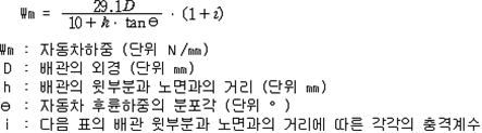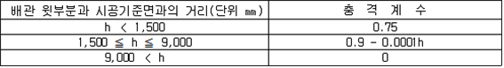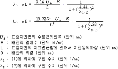 6. 풍하중은 배관에 대하여 수평방향으로 작용하고 배관의 수직단면 1㎡에 대하여 1,500N으로 작용하는 등분포 하중으로 할 것 7. 온도변화 영향의 계산에 있어서 온도차는 평균온도와 예상되는 최고 또는 최저 온도와의 차로 할 것 8. 도로 밑에 매설하는 배관에 관련된 타 공사의 영향은 배관의 윗부분과 노면과의 거리를 0.5m로 하여 계산한 자동차하중과 같은 것으로 할 것 제115조(배관에 관한 응력 계산방법) 배관에 관한 응력 계산방법은 다음 각 호에 정한 것에 의한다. 1. 내압에 의하여 배관에 생기는 원주방향응력은 다음 식에 의할 것 2. 토압, 열차하중 또는 자동차하중에 의하여 배관에 생기는 원주방향응력은 다음 식에 의할 것 3. 내압에 의하여 배관에 생기는 축방향 응력은 축방향의 변위가 내압의 영향을 받지 아니하는 배관의 경우에는 가목에 의하여 구하고 축방향의 변위가 내압의 영향을 받는 배관의 경우에는 나목에 의할 것 4. 열차하중 또는 자동차하중에 의하여 생기는 축방향 응력은 다음 식에 의할 것 5. 온도변화의 영향에 의하여 배관에 생기는 축방향 응력은 관이 전면적으로 온도변화의 영향을 받는 배관에 있어서는 다음 식에 의하고 그 밖의 배관에 있어서는 배관의 신축흡수부분에 생기는 응력 및 신축흡수부분의 반력에 의하여 직관부에 생기는 응력을 고려하여 구할 것 제116조(지진의 영향) ① 규칙 별표 15 Ⅱ제2호나목의 규정에 따른 지진의 영향은 지진동에 의한 관성력, 토압, 동수압, 부력, 지반의 변위 등에 의하여 생기는 영향으로 한다 ② 지진의 영향에 대한 배관의 응력계산방법은 제115조에서 규정한 것 외에 다음 각 호의 내용으로 한다. 다만, 지반의 특성 등을 특히 고려한 경우에는 이것에 의하지 아니할 수 있다. 1. 설계기반면(基盤面)에 따른 수평진도는 다음 식에 따라 구하고 설계기반면에 따른 수직진도는 그의 30% 이상으로 할 것 2. 설계수평진도는 다음 식에 따라 구하고, 설계수직진도는 그 30% 이상으로 할 것 (비고) 1종 지반은 제3기 이전의 지반 또는 암반까지의 홍적층의 두께가 10m 미만인 지반을, 2종 지반은 암반까지의 홍적층의 두께가 10m 이상이거나 암반까지의 충적층의 두께가 10m 미만인 지반을, 3종 지반은 암반까지의 충적층의 두께가 10m 이상 25m 미만으로 내진 설계상의 지지력을 무시할 필요가 있다고 인정되는 토층의 두께가 5m 미만인 지반을, 4종 지반은 기타의 지반을 각각 말한다. 3. 표층지반면 보다 윗쪽에 배관을 설치하는 때에는 제4호 및 제5호의 규정에 따라 계산할 것 4. 지진동에 의한 관성력은 배관등과 위험물의 자중에 설계수평진도 또는 설계수직진도를 곱하여 구할 것. 이 경우에 있어서 관성력의 작용위치는 당해 자중의 중심위치로, 그 작용방향은 수평 2방향 및 수직방향으로 한다. 5. 지진동에 의한 동수압은 가목 및 나목에 의할 것 6. 표층지반면 보다 아래쪽에 배관을 설치하는 때에는 제7호 내지 제10호의 규정에 따라 계산할 것 7. 지진시의 토압은 가목에 의할 것. 다만, 말뚝 등으로 지지되어 있는 배관에 작용하는 지진시의 토압은 나목에 따라 구하여야 한다. 8. 표층지반의 고유주기는 다음 식에 의할 것 9. 표층지반면의 수평변위진폭은 다음 식에 의할 것 10. 지반의 변위에 의하여 배관에 생기는 축방향응력은 다음 식에 의할 것 제117조(배관에 대한 합성응력) 제113조제1항제3호의 규정에 따른 원주방향응력과 축방향응력 및 관축에 대한 수직방향의 전단응력을 합성한 응력으로서 다음 식에 따라 구한다.<2013. 12. 17. 개정> 제118조(관이음의 설계 등) 배관에 사용하는 관이음은 다음 각 호에 따라 설계하여야 한다. 1. 관이음의 설계는 배관의 설계에 준하는 것 외에 관이음의 휨특성 및 응력집중을 고려하여 행할 것 2. 배관을 분기하는 경우는 미리 제작한 분기용 관이음 또는 분기구조물을 이용할 것. 이 경우 분기구조물에는 보강판을 부착하는 것을 원칙으로 한다. 3. 분기용 관이음, 분기구조물 및 레듀서(reducer)는 원칙적으로 이송기지 또는 전용부지내에 설치할 것 제119조(곡부의 설계 등) 배관의 곡부는 다음 각 호에 따라 설치하여야 한다. 다만, 현장 시공조건 그 밖의 특별한 이유에 의하여 부득이 한 경우에 있어서 3°를 초과하지 아니한 각도로 배관의 절단맞춤을 하는 때에는 제2호 및 제3호의 규정은 적용하지 아니한다. 1. 곡부의 설계는 배관의 설계에 준하는 것 외에 곡부의 휨특성 및 응력집중을 고려할 것 2. 곡부에는 제3호에 정하는 경우를 제외하고 미리 제작한 곡관[마이터 벤드(Miter Bend)관은 내압에 의하여 생기는 원주방향 응력이 배관의 규격최소항복점(배관의 재료규격에서 최소항복점을 정하지 아니한 것은 재료시험성적등에 의하여 보증된 항복점으로 한다. 다만, 당해 항복점이 재료의 규격에서 정한 인장강도의 최소치의 0.6배를 초과하는 경우에는 당해 항복점으로 한다)의 20% 이하의 경우에 한한다.]을 사용할 것 3. 현장에서 냉간구부림을 하는 경우의 최소곡율반경은 다음 표의 배관의 외경에 따른 각각의 수치로 할 것. 이 경우 배관의 내경은 배관 외경의 2.5% 이상 감소하지 아니하여야 한다. (주) D는 배관의 외경