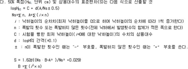 제1조(목적) 이 고시는「위험물안전관리법 시행령」,「위험물안전관리법 시행규칙」및「기업활동 규제완화에 관한 특별조치법」제52조제2항에 따라 위임된 사항과「위험물안전관리법」을 운용하기 위하여 필요한 세부기준을 규정함을 목적으로 한다. 제1장 총칙 제2조(산화성고체의 시험방법 및 판정기준) 「위험물안전관리법 시행령」(이하 "영"이라 한다) 별표 1 비고 제1호의 규정에 따른 산화성고체에 해당하는 산화성의 시험방법 및 판정기준은 제3조 및 제4조의 규정에 의하며, 충격에 대한 민감성의 시험방법 및 판정기준은 제5조 및 제6조의 규정에 따른다. 제2장 위험물의 시험 및 판정 제3조(산화성 시험방법) ① 분립상(매분당 160회의 타진을 받으며 회전하는 2㎜의 체를 30분에 걸쳐 통과하는 양이 10중량% 이상인 것을 말한다. 이하 같다) 물품의 산화성으로 인한 위험성의 정도를 판단하기 위한 시험은 연소시험으로 하며 다음 각 호에 의한다 1. 표준물질의 연소시험 가. 표준물질(시험에 있어서 기준을 정하는 물질을 말한다. 이하 같다)로서 150㎛ 이상 300㎛ 미만(입자의 크기의 측정방법은 매분당 160회의 타진을 받으며 30분간 회전하는 해당 규격의 체를 통과하는지 여부를 확인하여 행한다. 이하 같다)인 과염소산칼륨과 250㎛ 이상 500㎛ 미만인 목분(木粉)을 중량비 1:1로 섞어 혼합물 30g을 만들 것 나. 혼합물을 온도 20℃, 기압 1기압의 실내에서 높이와 바닥면의 직경비가 1:1.75가 되도록 원추형으로 무기질의 단열판 위에 쌓고 직경 2㎜의 원형 니크롬선에 통전(通電)하여 온도 1,000℃로 가열 된 것을 점화원으로 하여 원추형 혼합물의 아랫부분에 착화할 때까지 접촉할 것 다. 착화부터 불꽃이 없어지기까지의 시간을 측정할 것 라. 가목 내지 다목의 시험을 5회 이상 반복하여 평균연소시간을 구할 것 2. 시험물품의 연소시험 가. 시험물품(시험을 하고자 하는 물품을 말한다. 이하 같다)을 직경 1.18㎜ 미만으로 부순 것과 250㎛ 이상 500㎛ 미만인 목분을 중량비 1:1 및 중량비 4:1로 섞어 혼합물 30g을 각각 만들 것 나. 두 혼합물을 제1호나목 내지 라목의 방법에 의하여 각각 평균연소시간을 구한 다음, 둘 중 짧은 연소시간을 택할 것 ② 분립상 외의 물품의 산화성으로 인한 위험성의 정도를 판단하기 위한 시험은 대량연소시험으로 하며 그 방법은 다음 각 호에 의한다. 1. 표준물질의 대량연소시험 가. 표준물질로서 150㎛ 이상 300㎛ 미만인 과염소산칼륨과 250㎛ 이상 500㎛ 미만인 목분을 중량비 4:6으로 섞어 혼합물 500g을 만들 것 나. 혼합물을 온도 20℃, 기압 1기압의 실내에서 높이와 바닥면의 직경비가 1:2가 되도록 원추형으로 무기질의 단열판 위에 쌓고 점화원으로 원추형 혼합물의 아랫부분에 착화할 때까지 접촉할 것 다. 제1항제1호다목 및 라목에 의할 것 2. 시험물품의 대량연소시험 가. 시험물품과 250㎛ 이상 500㎛ 미만인 목분을 체적비 1:1로 섞어 혼합물 500g을 만들 것 나. 제1호나목 및 다목에 의할 것 제4조(산화성 판정기준) 산화성으로 인하여 산화성고체에 해당하는 것은 다음 각 호와 같다. 1. 분립상 물품에 있어서는 제3조제1항제2호의 시험에 의한 연소시간이 동항제1호의 시험에 의한 연소시간 이하인 것 2. 분립상 외의 물품에 있어서는 제3조제2항제2호의 시험에 의한 연소시간이 동항제1호의 시험에 의한 연소시간 이하인 것 제5조(충격민감성 시험방법) ① 분립상 물품의 민감성으로 인한 위험성의 정도를 판단하기 위한 시험은 낙구타격감도시험으로 하며 그 방법은 다음 각 호에 의한다 1. 표준물질의 낙구타격감도시험 가. 온도 20℃, 기압 1기압의 실내에서 직경 및 높이 12㎜의 강제(鋼製) 원기둥 위에 적린(180㎛ 미만인 것. 이하 같다) 5㎎을 쌓고 그 위에 표준물질로서 질산칼륨(150㎛ 이상 300㎛ 미만인 것. 이하 같다) 5㎎을 쌓은 후 직경 40㎜의 쇠구슬을 10㎝의 높이에서 혼합물의 위에 직접 낙하시켜 발화 여부를 관찰할 것. 이 경우에 폭발음, 불꽃 또는 연기를 발생하는 경우에는 폭발한 것으로 본다. 나. 가목에 의한 결과 폭발한 경우에는 낙하높이(H, 강제의 원기둥의 상면에서 강구의 하단까지의 높이)를 당해 낙하높이의 상용대수(logH)와 비교하여 상용대수의 차가 0.1이 되는 높이로 낮추고, 폭발하지 않는 경우에는 낙하높이를 당해 낙하높이의 상용대수와 비교하여 상용대수의 차가 0.1이 되는 높이로 높이는 방법(Up-down법)에 의하여 연속 40회 이상(최초로 폭발될 때부터 폭발되지 않을 때 또는 폭발되지 않을 때부터 폭발이 될 때까지의 횟수) 반복하여 강구를 낙하시켜 폭점산출법으로 표준물질과 적린과의 혼합물의 50% 폭점(폭발확률이 50%가 되는 낙하높이를 말한다. 이하 같다)을 구할 것. 다만, 낙하높이의 상용대수의 표준편차가 0.05에서 0.2까지의 범위 내에 있지 않는 경우에는 시험을 반복한다. 2. 시험물품의 낙구타격감도시험 가. 시험물품을 직경 1.18㎜ 미만으로 부순 것을 제1호가목에 의하여 시험을 10회 실시할 것. 이 경우 제1호나목에서 구한 50% 폭점을 낙하높이로 한다. 나. 가목에 의한 시험결과 폭발하는 경우 및 폭발하지 아니하는 경우가 모두 발생하는 경우에는 추가로 30