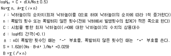 제1조(목적) 이 고시는「위험물안전관리법 시행령」,「위험물안전관리법 시행규칙」및「기업활동 규제완화에 관한 특별조치법」제52조제2항에 따라 위임된 사항과「위험물안전관리법」을 운용하기 위하여 필요한 세부기준을 규정함을 목적으로 한다. 제1장 총칙 제2조(산화성고체의 시험방법 및 판정기준) 「위험물안전관리법 시행령」(이하 "영"이라 한다) 별표 1 비고 제1호의 규정에 따른 산화성고체에 해당하는 산화성의 시험방법 및 판정기준은 제3조 및 제4조의 규정에 의하며, 충격에 대한 민감성의 시험방법 및 판정기준은 제5조 및 제6조의 규정에 따른다. 제2장 위험물의 시험 및 판정 제3조(산화성 시험방법) ① 분립상(매분당 160회의 타진을 받으며 회전하는 2㎜의 체를 30분에 걸쳐 통과하는 양이 10중량% 이상인 것을 말한다. 이하 같다) 물품의 산화성으로 인한 위험성의 정도를 판단하기 위한 시험은 연소시험으로 하며 다음 각 호에 의한다 1. 표준물질의 연소시험 가. 표준물질(시험에 있어서 기준을 정하는 물질을 말한다. 이하 같다)로서 150㎛ 이상 300㎛ 미만(입자의 크기의 측정방법은 매분당 160회의 타진을 받으며 30분간 회전하는 해당 규격의 체를 통과하는지 여부를 확인하여 행한다. 이하 같다)인 과염소산칼륨과 250㎛ 이상 500㎛ 미만인 목분(木粉)을 중량비 1:1로 섞어 혼합물 30g을 만들 것 나. 혼합물을 온도 20℃, 기압 1기압의 실내에서 높이와 바닥면의 직경비가 1:1.75가 되도록 원추형으로 무기질의 단열판 위에 쌓고 직경 2㎜의 원형 니크롬선에 통전(通電)하여 온도 1,000℃로 가열 된 것을 점화원으로 하여 원추형 혼합물의 아랫부분에 착화할 때까지 접촉할 것 다. 착화부터 불꽃이 없어지기까지의 시간을 측정할 것 라. 가목 내지 다목의 시험을 5회 이상 반복하여 평균연소시간을 구할 것 2. 시험물품의 연소시험 가. 시험물품(시험을 하고자 하는 물품을 말한다. 이하 같다)을 직경 1.18㎜ 미만으로 부순 것과 250㎛ 이상 500㎛ 미만인 목분을 중량비 1:1 및 중량비 4:1로 섞어 혼합물 30g을 각각 만들 것 나. 두 혼합물을 제1호나목 내지 라목의 방법에 의하여 각각 평균연소시간을 구한 다음, 둘 중 짧은 연소시간을 택할 것 ② 분립상 외의 물품의 산화성으로 인한 위험성의 정도를 판단하기 위한 시험은 대량연소시험으로 하며 그 방법은 다음 각 호에 의한다. 1. 표준물질의 대량연소시험 가. 표준물질로서 150㎛ 이상 300㎛ 미만인 과염소산칼륨과 250㎛ 이상 500㎛ 미만인 목분을 중량비 4:6으로 섞어 혼합물 500g을 만들 것 나. 혼합물을 온도 20℃, 기압 1기압의 실내에서 높이와 바닥면의 직경비가 1:2가 되도록 원추형으로 무기질의 단열판 위에 쌓고 점화원으로 원추형 혼합물의 아랫부분에 착화할 때까지 접촉할 것 다. 제1항제1호다목 및 라목에 의할 것 2. 시험물품의 대량연소시험 가. 시험물품과 250㎛ 이상 500㎛ 미만인 목분을 체적비 1:1로 섞어 혼합물 500g을 만들 것 나. 제1호나목 및 다목에 의할 것 제4조(산화성 판정기준) 산화성으로 인하여 산화성고체에 해당하는 것은 다음 각 호와 같다. 1. 분립상 물품에 있어서는 제3조제1항제2호의 시험에 의한 연소시간이 동항제1호의 시험에 의한 연소시간 이하인 것 2. 분립상 외의 물품에 있어서는 제3조제2항제2호의 시험에 의한 연소시간이 동항제1호의 시험에 의한 연소시간 이하인 것 제5조(충격민감성 시험방법) ① 분립상 물품의 민감성으로 인한 위험성의 정도를 판단하기 위한 시험은 낙구타격감도시험으로 하며 그 방법은 다음 각 호에 의한다 1. 표준물질의 낙구타격감도시험 가. 온도 20℃, 기압 1기압의 실내에서 직경 및 높이 12㎜의 강제(鋼製) 원기둥 위에 적린(180㎛ 미만인 것. 이하 같다) 5㎎을 쌓고 그 위에 표준물질로서 질산칼륨(150㎛ 이상 300㎛ 미만인 것. 이하 같다) 5㎎을 쌓은 후 직경 40㎜의 쇠구슬을 10㎝의 높이에서 혼합물의 위에 직접 낙하시켜 발화 여부를 관찰할 것. 이 경우에 폭발음, 불꽃 또는 연기를 발생하는 경우에는 폭발한 것으로 본다. 나. 가목에 의한 결과 폭발한 경우에는 낙하높이(H, 강제의 원기둥의 상면에서 강구의 하단까지의 높이)를 당해 낙하높이의 상용대수(logH)와 비교하여 상용대수의 차가 0.1이 되는 높이로 낮추고, 폭발하지 않는 경우에는 낙하높이를 당해 낙하높이의 상용대수와 비교하여 상용대수의 차가 0.1이 되는 높이로 높이는 방법(Up-down법)에 의하여 연속 40회 이상(최초로 폭발될 때부터 폭발되지 않을 때 또는 폭발되지 않을 때부터 폭발이 될 때까지의 횟수) 반복하여 강구를 낙하시켜 폭점산출법으로 표준물질과 적린과의 혼합물의 50% 폭점(폭발확률이 50%가 되는 낙하높이를 말한다. 이하 같다)을 구할 것. 다만, 낙하높이의 상용대수의 표준편차가 0.05에서 0.2까지의 범위 내에 있지 않는 경우에는 시험을 반복한다. 다. 50% 폭점(H50, 단위 cm) 및 상용대수의 표준편차(S)는 다음 식으로 산출할 것 2. 시험물품의 낙구타격감도시험 가. 시험물품을 직경 1.18㎜ 미만으로 부순 것을 제1호가목에 의하여 시험을 10회 실시할 것. 이 경우 제1호나목에서 구한 50% 폭점을 낙하높이로 한다. 나. 가목에 의한 시험결과 폭