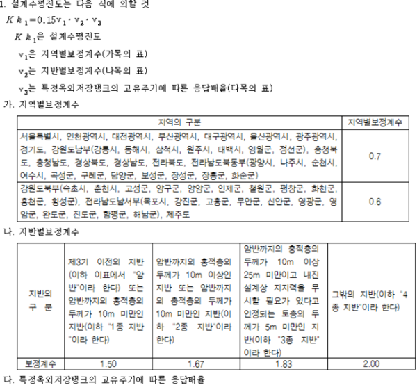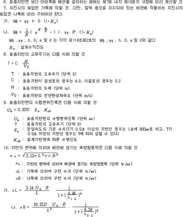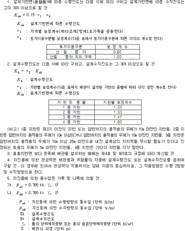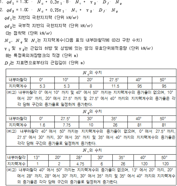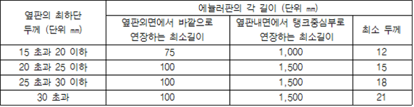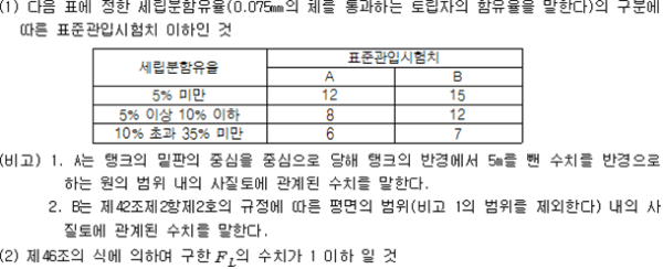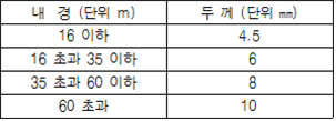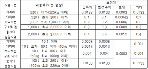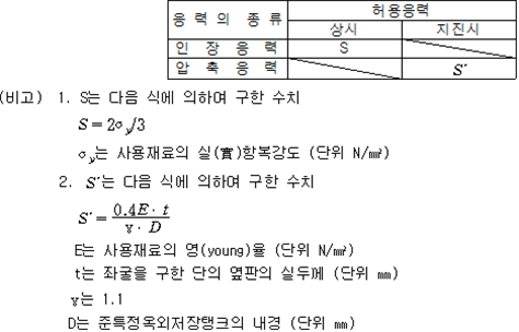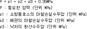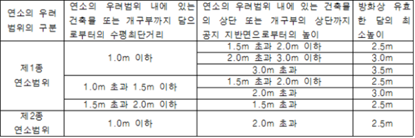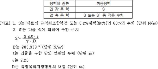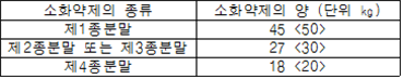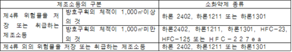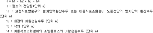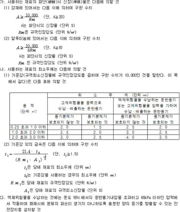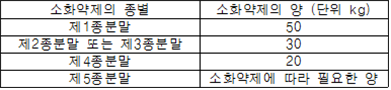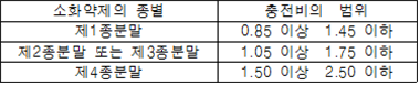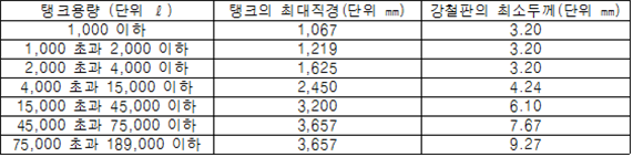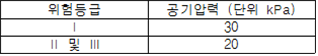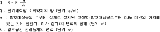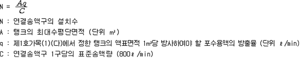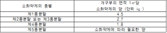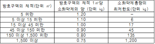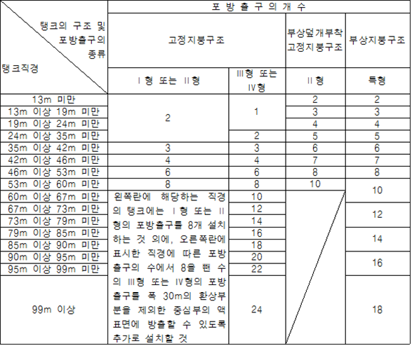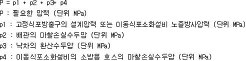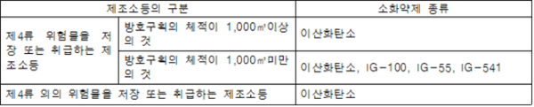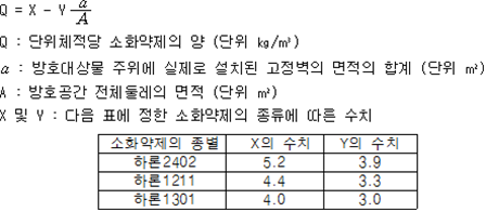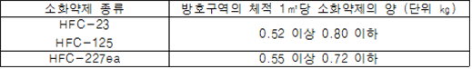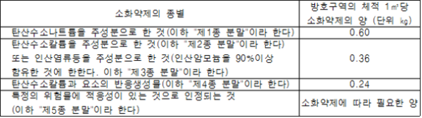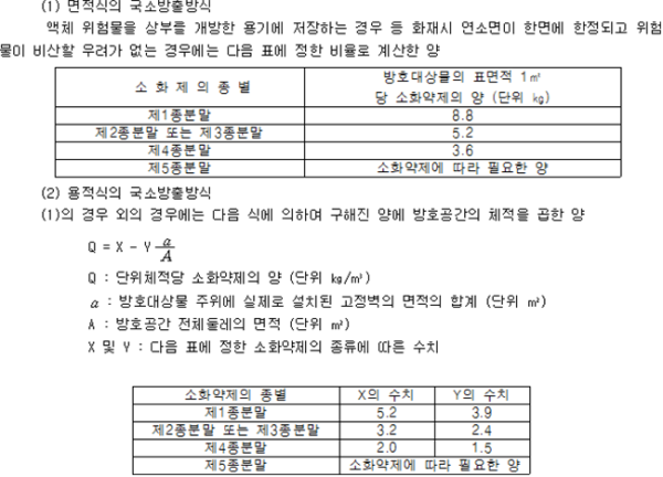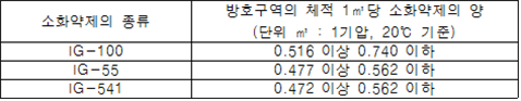 4. 전역방출방식 또는 국소방출방식의 분말소화설비의 기준은 다음 각 호에 정한 것에 의할 것 가. 제134조제4호 가목 및 나목(1)의 규정의 예에 의할 것 나. 분말소화설비에 사용하는 소화약제는 제1종분말, 제2종분말, 제3종분말, 제4종분말 또는 제5종분말로 할 것 다. 저장용기등의 충전비는 다음 표에 정한 소화약제의 종별에 따른 것으로 할 것 라. 저장용기등은 제134조제4호라목의 규정의 예에 의하는 것 외에 다음에 정하는 것에 의할 것 (1) 저장탱크는「압력용기-설계 및 제조 일반」(KS B 6750)의 기준에 적합한 것 또는 이와 동등 이상의 강도 및 내식성이 있는 것을 사용할 것 (2) 저장용기등에는 안전장치를 설치할 것 (3) 저장용기(축압식인 것은 내압력이 1.0MPa인 것에 한한다)에는 용기밸브를 설치할것 (4) 가압식의 저장용기등에는 방출밸브를 설치할 것 (5) 보기 쉬운 장소에 충전소화약제량, 소화약제의 종류, 최고사용압력(가압식인 것에 한한다) 제조년월 및 제조자명을 표시할 것 마. 저장용기등에는 잔류가스를 배출하기 위한 배출장치를, 배관에는 잔류소화약제를 처리하기 위한 클리닝장치를 설치할 것 바. 가압용가스용기는 저장용기등의 직근에 설치되고 확실하게 접속되어 있을 것 사. 가압용 가스용기에는 안전장치 및 용기밸브를 설치할 것 아. 가압용 또는 축압용 가스는 다음에 정하는 것에 의할 것 (1) 가압용 또는 축압용 가스는 질소 또는 이산화탄소로 할 것 (2) 가압용 가스로 질소를 사용하는 것은 소화약제 1㎏당 온도 35℃에서 0MPa의 상태로 환산한 체적 40ℓ이상, 이산화탄소를 사용하는 것은 소화약제 1㎏당 20g에 배관의 청소에 필요한 양을 더한 양 이상일 것 (3) 축압용 가스로 질소가스를 사용하는 것은 소화약제 1㎏당 온도 35℃에서 0MPa의 상태로 환산한 체적 10ℓ에 배관의 청소에 필요한 양을 더한 양 이상, 이산화탄소를 사용하는 것은 소화약제 1㎏당 20g에 배관의 청소에 필요한 양을 더한 양 이상일 것 (4) 클리닝에 필요한 양의 가스는 별도의 용기에 저장할 것 자. 배관은 다음에 정하는 것에 의할 것 (1) 전용으로 할 것 (2) 강관의 배관은「배관용탄소강관」(KSD3507)에 적합하고 아연도금 등에 의하여 방식처리를 한 것 또는 이와 동등 이상의 강도 및 내식성을 갖는 것을 사용할 것. 다만, 축압식인 것 중에서 온도 20℃에서 압력이 2.5MPa을 초과하고 4.2MPa 이하인 것에 있어서는「압력배관용탄소강관」(KS D 3562) 중에서 스케줄40 이상이고 아연도금 등에 의하여 방식처리를 한 것 또는 이와 동등 이상의 강도와 내식성이 있는 것을 사용할 것 (3) 동관의 배관은「이음매없는구리및구리합금관」(KS D 5301) 또는 이와 동등 이상의 강도 및 내식성을 갖는 것으로 조정압력 또는 최고사용압력의 1.5배 이상의 압력에 견딜 수 있는 것을 사용할 것 (4) 관이음쇠는「나사식강관제관이음쇠」(KS B 1533),「나사식가단주철제관이음쇠」(KS B 1531),「강제용접식관플랜지」(KS B 1503),「스테인리스강제용접식플랜지」(KS B 1506),「배관용 강제맞대기용접식관이음쇠」(KS B 1541) 또는 이와 동등 이상의 강도, 내식성 및 내열성을 갖는 것으로 할 것 (5) 밸브류는 다음에 정한 것에 의할 것 (가) 소화약제를 방사하는 경우에 현저하게 소화약제와 가압용ㆍ축압용가스가 분리되거나 소화약제가 잔류할 우려가 없는 구조일 것 (나) 접속할 관의 구경에 맞는 규격일 것 (다) 재질은「주강 플랜지형 밸브」(KS B 2361),「구상흑연주철품」(KS D 4302)로서 방식처리가 된 것 또는 이와 동등 이상의 강도, 내식성 및 내열성을 갖는 것으로 할 것 (라) 밸브류는 개폐위치 또는 개폐방향을 표시할 것 (마) 방출밸브 및 가압용가스용기밸브의 수동조작부는 화재시 쉽게 접근 가능하고 안전한 장소에 설치할 것 (6) 저장용기등으로부터 배관의 굴곡부까지의 거리는 관경의 20배 이상 되도록 할 것 다만, 소화약제와 가압용ㆍ축압용가스가 분리되지 않도록 조치를 한 경우에는 그러하지 아니하다. (7) 낙차는 50m 이상일 것 (8) 동시에 방사하는 분사헤드의 방사압력이 균일하도록 설치할 것 차. 가압식의 분말소화설비에는 2.5MPa 이하의 압력으로 조정할 수 있는 압력조정기를 설치할 것 카. 가압식의 분말소화설비에는 다음에 정하는 것에 의하여 정압작동장치를 설치할 것 (1) 기동장치의 작동후 저장용기등의 압력이 설정압력이 되었을 때 방출밸브를 개방시키는 것일 것 (2) 정압작동장치는 저장용기등마다 설치할 것 타. 축압식의 분말소화설비에는 사용압력의 범위를 녹색으로 표시한 지시압력계를 설치할 것 파. 선택밸브는 제134조제4호아목의 규정의 예에 의할 것 하. 저장용기등과 선택밸브등 사이에는 안전장치 또는 파괴판을 설치할 것 거. 기동용가스용기는 제134조제4호차목의 규정의 예에 의하는 것 외에 다음에 정하는 것에 의할 것 (1) 내용적은 0.27ℓ 이상으로 하고 당해 용기에 저장하는 가스의 양은 145g 이상일 것 (2) 충전비는 1.5 이상일 것 너. 기동장치는 제134조제4호카목(IG-100, IG-55 또는 IG-541과 관련된 부분은 제외한다)의 규정의 예에 의할 것 더. 음향경보장치는 제134조제4호타목의 규정의 예에 의할 것 러. 전역방출방식인 것에는 제