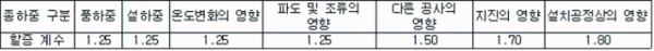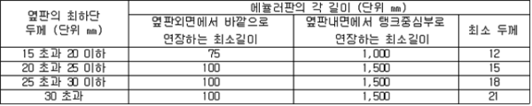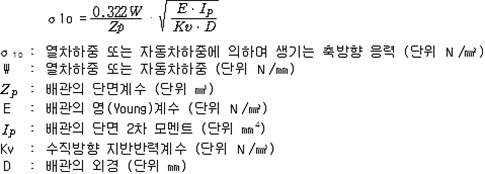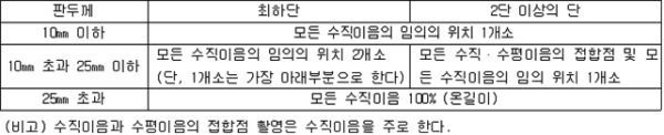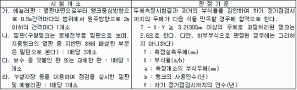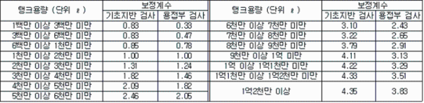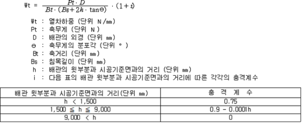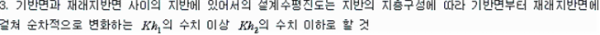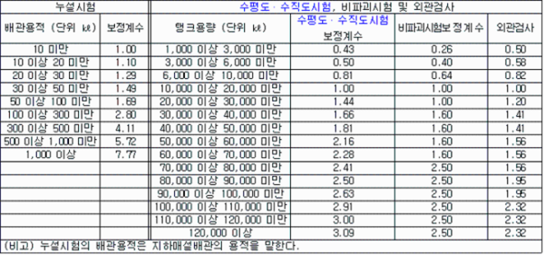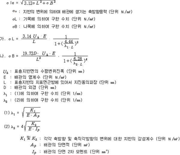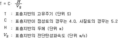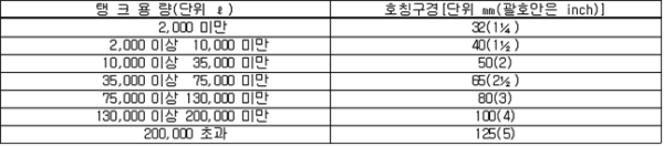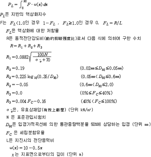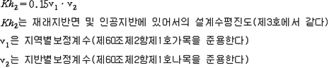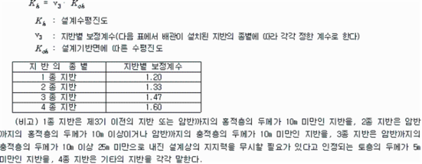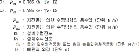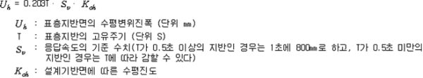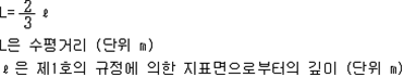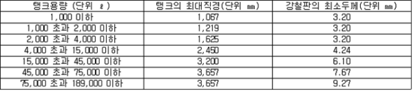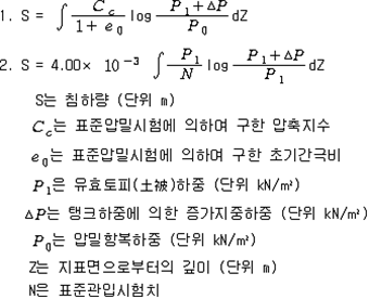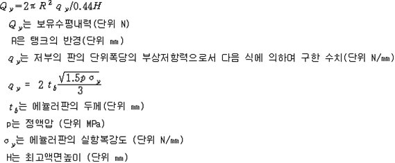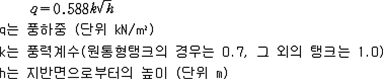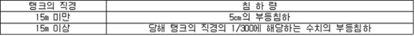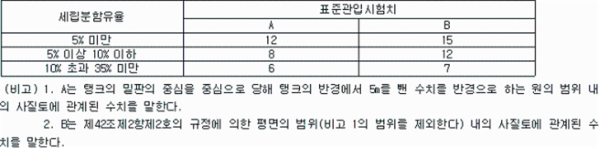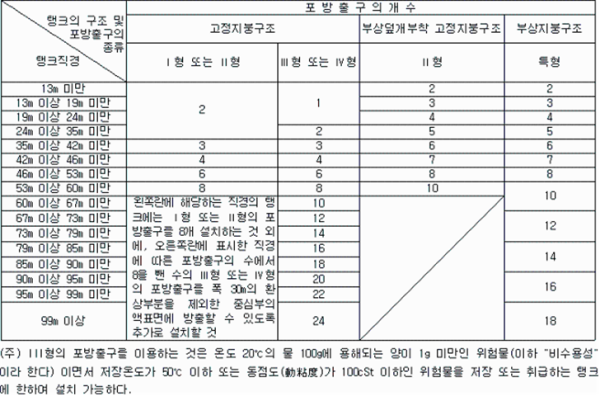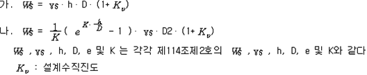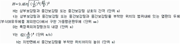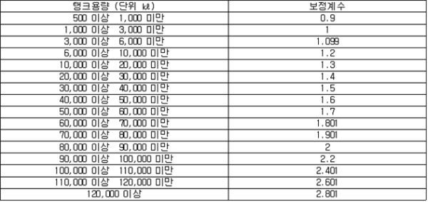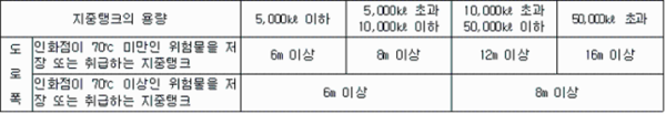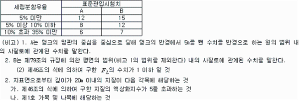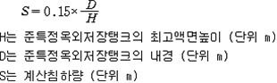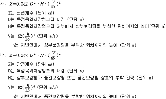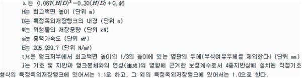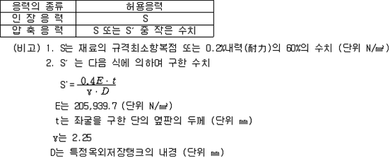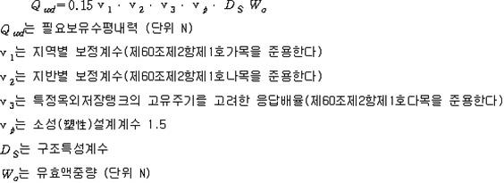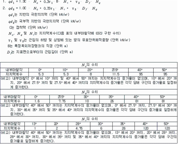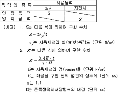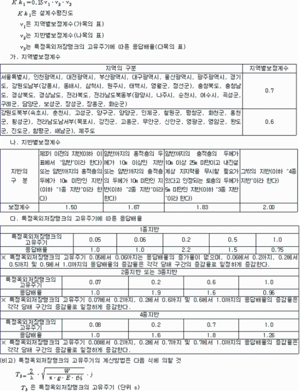 2. 지표면으로부터 깊이가 20m 이내의 지질이 다음 각목에 해당하는 것 가. 제46조의 식에 의하여 구한 지질의 액상화지수가 5를 초과하는 것 나. 제1호 가목 및 나목에 해당하는 것 제69조(준특정옥외저장탱크의 기초의 보강) 규칙 별표 6 Ⅴ제3호나목2)나)의 규정에 의한 기초의 구조는 다음 각호의 1에 해당하는 것으로 한다. 1. 국부적인 침하를 방지할 수 있는 철근콘크리트스라브를 가지는 것 2. 국부적인 침하를 방지할 수 있는 일체구조의 철근콘크리트링을 옆판의 직하에 가지는 것 3. 국부적인 활동(滑動)을 방지할 수 있는 일체구조의 철근콘크리트링을 옆판의 외측에 가지는 것 제70조(준특정옥외저장탱크의 활동의 안전율) 규칙 별표 6 Ⅴ제3호다목의 규정에 의한 안전율은 1.2 이상의 수치로 한다. 이 경우에 안전율은 제53조에 정한 계산방법에 의한다. 제71조(준특정옥외저장탱크의 기초의 구조와 주하중 및 종하중) ① 규칙 별표 6 Ⅴ제3호라목 및 마목의 규정에 의한 기초는 다음 각호와 같다. 1. 두께 0.3m 이하로 균일하게 메울 것 2. 기초견의 경사도는 1/20 이하이고 기초의 측면의 경사도는 1/2 이하 일 것 3. 기초견 및 기초의 측면은 빗물 등이 침투하지 아니하도록 아스팔트 등으로 보호할 것 ② 준특정옥외저장탱크에 관계된 주하중 및 적설하중, 풍하중, 지진의 영향 등의 종하중의 계산방법은 제58조제1호·제3호·제4호, 제59조제1항 및 제60조제1항제1호 내지 제5호·동조제2항제1호·제2호의 규정을 준용한다. 이 경우 저장하는 위험물의 중량에 있어서는 당해 저장하는 위험물의 실비중에 기초하여 계산할 수 있다. 제72조(준특정옥외저장탱크의 허용응력) 규칙 별표 6 Ⅷ제2호나목 및 다목의 규정에 의한 허용응력은 다음 표와 같다. 제73조(준특정옥외저장탱크의 보유수평내력등의 계산방법) 규칙 별표 6 Ⅷ제3호의 규정에 의한 보유수평내력 및 필요보유수평내력의 계산방법은 제56조를 준용한다. 제74조(옥외저장탱크의 지진동에 의한 관성력 및 풍하중의 계산방법) 규칙 별표 6 Ⅵ제3호나목의 규정에 의한 지진동에 의한 관성력 및 풍하중의 계산방법은 다음 각호에 의한다. 1. 지진동에 의한 관성력은 탱크의 자중과 당해 탱크에 저장하는 위험물의 중량의 합에 설계수평진도를 곱하여 구할 것. 이 경우에 설계수평진도는 다음 식에 의하여 구한다. 2. 풍하중은 제59조제1항에 의할 것 제75조(지중탱크의 설치장소의 제한) 규칙 별표 6 XII 제2호가목의 규정에 의한 장소는 다음 각호와 같다. 1. 「수도법」에 의한 수도시설(위험물의 유입의 우려가 있는 것에 한한다)로부터 수평거리 300m의 범위내의 장소 2. 지하철, 지하터널 또는 지하가 기타 지하공작물(당해 지중탱크에 관계된 갱도 등의 지하공작물을 제외한다)로부터 수평거리가 지중탱크 수평단면의 내경의 1/2 또는 지중탱크 밑판의 윗면에서 지반면까지의 탱크 높이 중 큰 것과 같은 거리의 범위내의 장소 제76조(지중탱크의 설치장소의 제한) 규칙 별표 6 XII 제2호라목2)나)의 규정에 의한 지반의 범위는 다음 각호와 같다. 1. 깊이의 범위는 탱크의 저부(제84조제3호에 정하는 배수층을 설치하는 경우에 있어서는 배수층의 아랫면. 이하 이 조에 같다)로부터 다음 각목에 정한 것으로 할 것 가. 지중탱크의 하중을 지지하는 지층이 수평층상인 경우에는 탱크의 저부로부터 깊이 15m 나. 가목에 해당하는 지층 외의 것은 규칙 별표 6 XII 제2호라목2)나)의 규정에 의한 지중탱크 하중에 대한 지지력의 안전율 및 계산침하량을 확보하는데 필요한 깊이 2. 평면의 범위는 다음 식에 의하여 구한 수평거리(당해 거리가 5m 미만인 경우에는 5m, 10m를 초과하는 경우에는 10m)에 지중탱크의 반경을 더한 거리를 반경으로 하여 지중탱크의 밑판의 중심을 중심으로 한 원의 범위로 할 것 제77조(지중탱크의 지지력의 안전율) 규칙 별표 6 XII 제2호라목2)나)의 규정에 의한 안전율의 수치는 3이상으로 한다. 제78조(지중탱크의 계산침하량) 규칙 별표 6 XII 제2호라목2)나)의 규정에 의한 계산침하량의 수치는 당해 탱크의 직경에 대한 침하차(탱크밑판 중심부의 침하량과 옆판하단의 침하량의 차의 최대치를 말한다)의 비율이 1/600 이하이어야 한다. 제79조(지중탱크의 지반의 범위) 규칙 별표 6 XII 제2호라목2)라)의 규정에 의한 지반의 범위 중 깊이의 범위는 지반면에서부터 탱크 저부의 15m 아래까지로 하며, 평면의 범위는 당해 탱크의 반경에 10m를 더한 거리를 반경으로 하여 탱크 밑판의 중심을 중심으로 한 원의 범위로 한다. 제80조(지중탱크의 지반의 지질의 제한) 규칙 별표 6 XII 제2호라목2)라)의 규정에 의한 지반의 지질은 다음 각호의 1에 해당하는 것으로 한다. 1. 지반의 지질이 다음 각목에 해당하는 것 가. 지하수에 의하여 포화되어 있는 것 다. 다음 중 하나에 해당하는 것 (1) 다음 표에 정한 세립분함유율(0.075㎜의 체를 통과하는 토립자의 함유율을 말한다)의 구분에 따른 표준관입시험치 이하인 것 제81조(지중탱크의 지반의 활동의 안전율) 규칙 별표 6 XII 제2호라목2)마)의 규정에 의한 지반의 활동의 안전율은 1.3 이상의 수치로 한다. 제82조(지중탱크의 인공지반) 규칙 별표 6 XII 