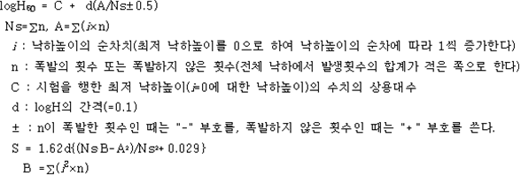 제1장 총칙 제1조(목적) 이 고시는「위험물안전관리법 시행령」,「위험물안전관리법 시행규칙」및「기업활동 규제완화에 관한 특별조치법」제52조제2항의 규정에 의하여 위임된 사항과「위험물안전관리법」을 운용하기 위하여 필요한 세부기준을 규정하는 것을 목적으로 한다. 제2장 위험물의 시험 및 판정 제2조(산화성고체의 시험방법 및 판정기준) 「위험물안전관리법 시행령」(이하 "영"이라 한다) 별표 1 비고 제1호의 규정에 의한 산화성고체에 해당하는 산화성의 시험방법 및 판정기준은 제3조 및 제4조의 규정에 의하며, 충격에 대한 민감성의 시험방법 및 판정기준은 제5조 및 제6조의 규정에 의한다. 제3조(산화성 시험방법) ① 분립상(매분당 160회의 타진을 받으며 회전하는 2㎜의 체를 30분에 걸쳐 통과하는 양이 10중량% 이상인 것을 말한다. 이하 같다) 물품의 산화성으로 인한 위험성의 정도를 판단하기 위한 시험은 연소시험으로 하며 그 방법은 다음 각호에 의한다. 1. 표준물질의 연소시험 가. 표준물질(시험에 있어서 기준을 정하는 물질을 말한다. 이하 같다)로서 150㎛ 이상 300㎛ 미만(입자의 크기의 측정방법은 매분당 160회의 타진을 받으며 30분간 회전하는 해당 규격의 체를 통과하는지 여부를 확인하여 행한다. 이하 같다)인 과염소산칼륨과 250㎛ 이상 500㎛ 미만인 목분(木粉)을 중량비 1:1로 섞어 혼합물 30g을 만들 것 나. 혼합물을 온도 20℃, 기압 1기압의 실내에서 높이와 바닥면의 직경비가 1:1.75가 되도록 원추형으로 무기질의 단열판 위에 쌓고 직경 2㎜의 원형 니크롬선에 통전(通電)하여 온도 1,000℃로 가열 된 것을 점화원으로 하여 원추형 혼합물의 아랫부분에 착화할 때까지 접촉할 것 다. 착화부터 불꽃이 없어지기까지의 시간을 측정할 것 라. 가목 내지 다목의 시험을 5회 이상 반복하여 평균연소시간을 구할 것 2. 시험물품의 연소시험 가. 시험물품(시험을 하고자 하는 물품을 말한다. 이하 같다)을 직경 1.18㎜ 미만으로 부순 것과 250㎛ 이상 500㎛ 미만인 목분을 중량비 1:1 및 중량비 4:1로 섞어 혼합물 30g을 각각 만들 것 나. 두 혼합물을 제1호나목 내지 라목의 방법에 의하여 각각 평균연소시간을 구한 다음, 둘 중 짧은 연소시간을 택할 것 ② 분립상 외의 물품의 산화성으로 인한 위험성의 정도를 판단하기 위한 시험은 대량연소시험으로 하며 그 방법은 다음 각호에 의한다. 1. 표준물질의 대량연소시험 가. 표준물질로서 150㎛ 이상 300㎛ 미만인 과염소산칼륨과 250㎛ 이상 500㎛ 미만인 목분을 중량비 4:6으로 섞어 혼합물 500g을 만들 것 나. 혼합물을 온도 20℃, 기압 1기압의 실내에서 높이와 바닥면의 직경비가 1:2가 되도록 원추형으로 무기질의 단열판 위에 쌓고 점화원으로 원추형 혼합물의 아랫부분에 착화할 때까지 접촉할 것 다. 제1항제1호다목 및 라목에 의할 것 2. 시험물품의 대량연소시험 가. 시험물품과 250㎛ 이상 500㎛ 미만인 목분을 체적비 1:1로 섞어 혼합물 500g을 만들 것 나. 제1호나목 및 다목에 의할 것 제4조(산화성 판정기준) 산화성으로 인하여 산화성고체에 해당하는 것은 다음 각호와 같다. 1. 분립상 물품에 있어서는 제3조제1항제2호의 시험에 의한 연소시간이 동항제1호의 시험에 의한 연소시간 이하인 것 2. 분립상 외의 물품에 있어서는 제3조제2항제2호의 시험에 의한 연소시간이 동항제1호의 시험에 의한 연소시간 이하인 것 제5조(충격민감성 시험방법) ① 분립상 물품의 민감성으로 인한 위험성의 정도를 판단하기 위한 시험은 낙구타격감도시험으로 하며 그 방법은 다음 각호에 의한다. 1. 표준물질의 낙구타격감도시험 가. 온도 20℃, 기압 1기압의 실내에서 직경 및 높이 12㎜의 강제(鋼製) 원기둥 위에 적린(180㎛ 미만인 것. 이하 같다) 5㎎을 쌓고 그 위에 표준물질로서 질산칼륨(150㎛ 이상 300㎛ 미만인 것. 이하 같다) 5㎎을 쌓은 후 직경 40㎜의 쇠구슬을 10㎝의 높이에서 혼합물의 위에 직접 낙하시켜 발화 여부를 관찰할 것. 이 경우에 폭발음, 불꽃 또는 연기를 발생하는 경우에는 폭발한 것으로 본다. 나. 가목에 의한 결과 폭발한 경우에는 낙하높이(H, 강제의 원기둥의 상면에서 강구의 하단까지의 높이)를 당해 낙하높이의 상용대수(logH)와 비교하여 상용대수의 차가 0.1이 되는 높이로 낮추고, 폭발하지 않는 경우에는 낙하높이를 당해 낙하높이의 상용대수와 비교하여 상용대수의 차가 0.1이 되는 높이로 높이는 방법(Up-down법)에 의하여 연속 40회 이상(최초로 폭발될 때부터 폭발되지 않을 때 또는 폭발되지 않을 때부터 폭발이 될 때까지의 횟수) 반복하여 강구를 낙하시켜 폭점산출법으로 표준물질과 적린과의 혼합물의 50% 폭점(폭발확률이 50%가 되는 낙하높이를 말한다. 이하 같다)을 구할 것. 다만, 낙하높이의 상용대수의 표준편차가 0.05에서 0.2까지의 범위 내에 있지 않는 경우에는 시험을 반복한다. 다. 50% 폭점(H50, 단위 cm) 및 상용대수의 표준편차(S)는 다음 식으로 산출할 것 2. 시험물품의 낙구타격감도시험 가. 시험물품을 직경 1.18㎜ 미만으로 부순 것을 제1호가목에 의하여 시험을 10회 실시할 것. 이 경우 제1호나목에서 구한 50% 폭점을 낙하높이로 한다. 나. 