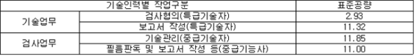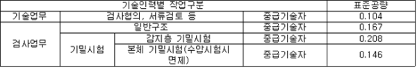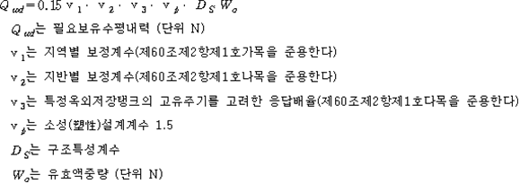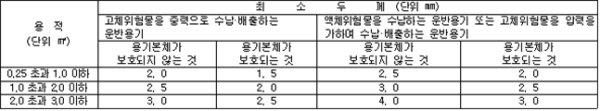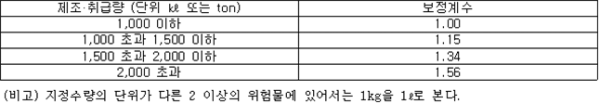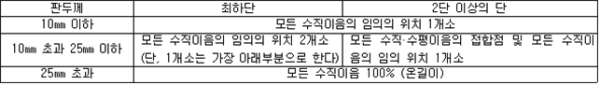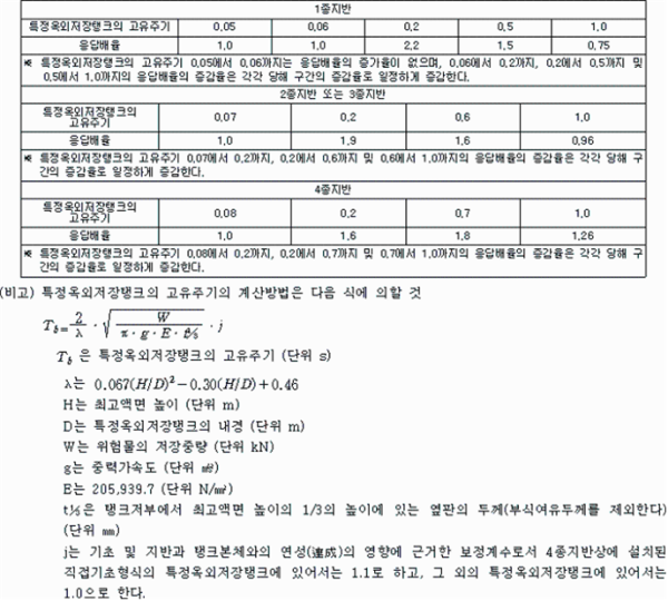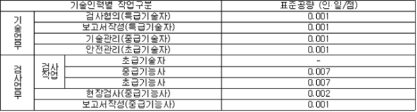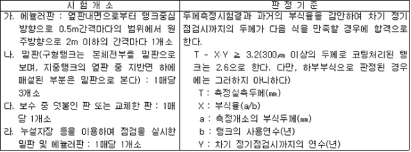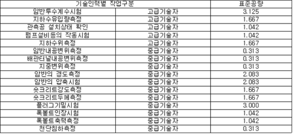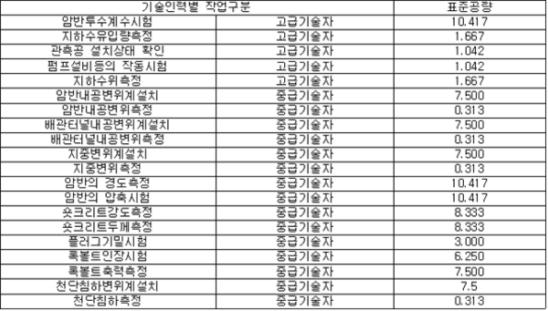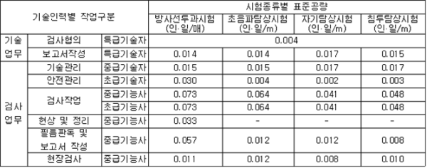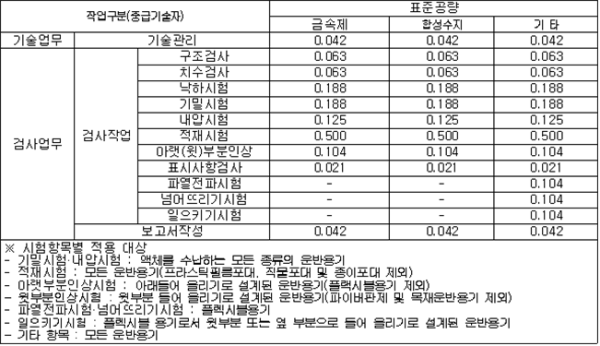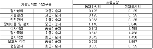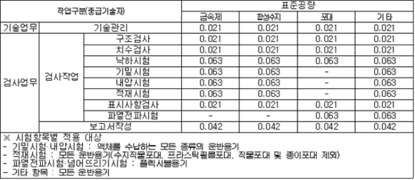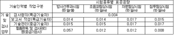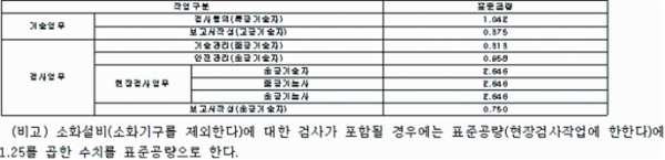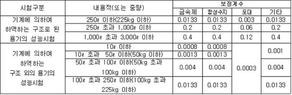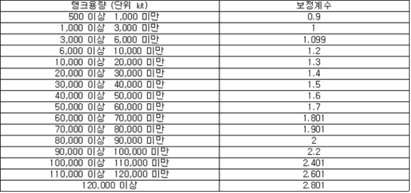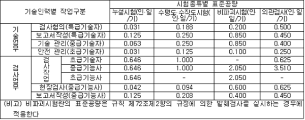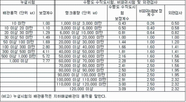 라. 암반탱크검사의 표준공량 마. 이중벽탱크의 수압검사 수수료는 규칙 별표 25 제3호의 규정에 의한 수수료의 50%를 적용하며, 규칙 별표 8 Ⅰ제6호 후단의 규정에 의하여 수압검사를 기밀시험과 비파괴시험으로 대신하는 경우에는 제158조제4항의 규정에 의한 기밀시험 수수료의 50%와 용접부에 대한 비파괴시험 수수료를 합한 금액으로 할 것. 이 경우 용접부에 대한 비파괴시험 수수료 산정에 있어서 표준공량은 0.208로 하고, 기술인력별 구분은 중급기술자로 하며, 보정계수는 제158조제4항제1호나목에 의한다. 2. 재시험 수수료는 다음 각목에 의할 것 가. 기초·지반검사의 재시험 수수료는 최초시험 수수료에 최초시험개소 대비 재시험개소의 비율을 곱한 금액으로 할 것 나. 100만ℓ 이상인 탱크 및 이중벽탱크의 용접부검사의 재시험 수수료는 다음 표에 정한 표준공량을 적용하여 산출한 직접인건비에 50%를 적용할 것 다. 암반탱크검사의 재시험 수수료는 최초시험 수수료의 50%를 적용할 것 3. 기초·지반검사 중 표준관입시험을 탱크안전성능검사 신청전에 기술원이 실시한 경우에는 전체 수수료의 70%를 적용할 것 4. 납부액의 1천원 미만은 절사할 것 ② 규칙 별표 25 제3호나목의 규정에 의한 탱크안전성능검사 중 기초·지반검사, 이중벽탱크에 대한 수압검사, 용접부검사 및 암반탱크검사를 규칙 제12조제5항·제13조제2항·제14조제2항 또는 제15조제2항의 규정에 의하여 기술원이 확인하는 방법에 의하여 실시하는 경우의 수수료 산정기준은 다음 각호와 같다. 1. 기초·지반검사의 수수료는 최초시험 수수료에 최초시험개소 대비 변경허가에 따른 시험개소의 비율을 곱한 금액으로 할 것 2. 용접부검사의 수수료는 최초시험 수수료에 다음 각목의 규정에 의한 시험종류별 대비율(최초시험량 대비 변경허가에 따른 시험량의 비율을 말한다)의 평균치(이하 "평균대비율"이라 한다)를 곱하여 산출한 금액으로 할 것〈2006. 8. 3 개정〉 가. 평균대비율 = (0.5×자기탐상시험 대비율) + (0.35×방사선투과시험 대비율) + (0.15×침투탐상시험 대비율) 나. 대비율은 소수점 이하 셋째자리를 절사할 것 다. 평균대비율은 가목에 의하여 구한 수치가 0.05 이하의 경우에는 0.05로 하며, 0.05를 초과하는 경우 중 소수점 이하 둘째자리가 1을 초과하고 5 이하인 경우에는 소수점 이하 둘째자리에서 올림을 한 수치에서 0.05를 뺀 수치로 하며, 소수점 이하 둘째자리가 5를 초과하거나 0인 경우에는 소수점 이하 둘째자리에서 올림을 한 수치로 할 것〈2007. 12. 3 개정〉 3. 재시험 수수료는 다음 각목에 의할 것 가. 기초·지반검사의 재시험 수수료는 변경허가에 따른 최초시험 수수료에 변경허가에 따른 최초시험개소 대비 재시험개소의 비율을 곱한 금액으로 할 것 나. 용접부검사의 재시험 수수료는 제1항제1호나목의 표에 정한 표준공량을 적용하여 산출한 직접인건비에 50%를 곱하여 산정 할 것 4. 납부액의 1천원 미만은 절사할 것 5. 이중벽탱크에 대한 수압검사 및 암반탱크검사의 경우에는 제1항의 규정에 의한 설치허가에 따른 탱크성능검사 수수료의 예에 의할 것 제160조(기술원이 실시하는 완공검사의 수수료) ① 규칙 별표 25 제4호의 규정에 의한 기술원이 실시하는 완공검사 중 제조소 또는 일반취급소의 완공검사 수수료 산정기준은 다음 각호와 같다. 1. 표준공량 및 보정계수는 다음 각목에 의할 것 가. 표준공량 (비고) 소화설비(소화기구를 제외한다)에 대한 검사가 포함될 경우에는 표준공량(현장검사작업에 한한다)에 1.25를 곱한 수치를 표준공량으로 한다. 나. 보정계수 2. 재검사 수수료는 최초시험 수수료의 50%를 적용 할 것 3. 납부액의 1천원 미만은 절사할 것 ② 규칙 별표 25 제4호의 규정에 의한 기술원이 실시하는 완공검사 중 옥외탱크저장소의 완공검사 수수료 산정기준은 다음 각호와 같다. 〈2007. 12. 3 신설〉 1. 표준공량 및 보정계수는 다음 각목에 의할 것 가. 표준공량 (비고) 소화설비(소화기구를 제외한다)에 대한 검사가 포함될 경우에는 표준공량(현장검사작업에 한한다)에 1.25를 곱한 수치를 표준공량으로 한다. 나. 보정계수 2. 변경허가에 따른 완공검사 수수료는 최초시험 수수료의 50%를 적용 할 것 3. 재검사 수수료는 최초시험 수수료의 50%를 적용 할 것 4. 납부액의 1천원 미만은 절사할 것 ③ 규칙 별표 25 제4호의 규정에 의한 기술원이 실시하는 완공검사 중 암반탱크저장소의 완공검사 수수료 산정기준은 다음 각호와 같다. 〈2007. 12. 3 신설〉 1. 표준공량 및 보정계수는 다음 각목에 의할 것 가. 표준공량 나. 보정계수 2. 변경허가에 따른 완공검사 수수료는 최초시험 수수료의 50%를 적용 할 것 3. 재검사 수수료는 최초시험 수수료의 50%를 적용 할 것 4. 납부액의 1천원 미만은 절사할 것 제161조(정기검사의 수수료) 규칙 별표 25 제8호의 정기검사의 수수료 산정기준은 다음 각호와 같다. 1. 표준공량 및 보정계수는 다음 각목에 의할 것 가. 표준공량 〈2007. 12. 3 개정〉〈2009. 3. 17 개정〉 나. 보정계수(누설시험 및 수평도·수직도시험에 있어서는 검사작업에 한하여 보정계수를 적용한다) 2. 두께측정시험의 표준공량