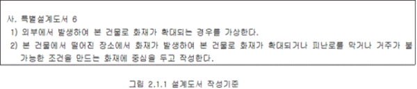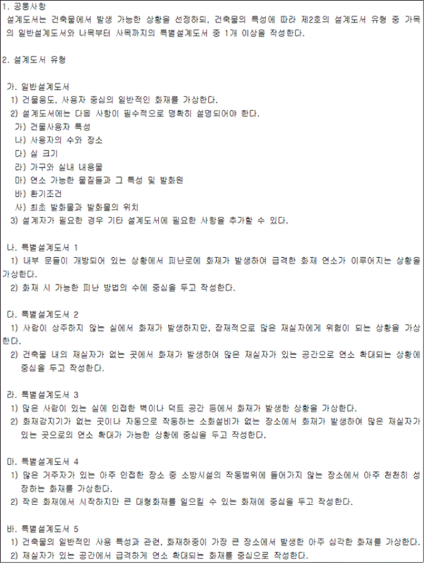 2. 기술기준 2.1 설계도서 작성 2.1.1 미분무소화설비의 성능을 확인하기 위하여 하나의 발화원을 가정한 설계도서는 다음의 기준 및 그림 2.1.1을 고려하여 작성되어야 하며, 설계도서는 일반설계도서와 특별설계도서로 구분한다. (1) 점화원의 형태 (2) 초기 점화되는 연료 유형 (3) 화재 위치 (4) 문과 창문의 초기상태(열림, 닫힘) 및 시간에 따른 변화상태 (5) 공기조화설비, 자연형(문, 창문) 및 기계형 여부 (6) 시공 유형과 내장재 유형 2.1.2 일반설계도서는 유사한 특정소방대상물의 화재사례 등을 이용하여 작성하고, 특별설계도서는 일반설계도서에서 발화 장소 등을 변경하여 위험도를 높게 만들어 작성해야 한다. 2.1.3 2.1.1 및 2.1.2에도 불구하고 검증된 기준에서 정하고 있는 것을 사용할 경우에는 적합한 도서로 인정할 수 있다. 2.2 설계도서의 검증 2.2.1 소방관서에 허가동의를 받기 전에 법 제46조제1항에 따라 성능시험기관으로 지정받은 기관에서 그 성능을 검증받아야 한다. 2.2.2 설계도서의 변경이 필요한 경우 2.2.1에 의해 재검증을 받아야 한다. 2.3 수원 2.3.1 미분무소화설비에 사용되는 소화용수는 「먹는물관리법」 제5조에 적합하고, 저수조 등에 충수할 경우 필터 또는 스트레이너를 통해야 하며, 사용되는 물에는 입자ㆍ용해고체 또는 염분이 없어야 한다. 2.3.2 배관의 연결부(용접부 제외) 또는 주배관의 유입측에는 필터 또는 스트레이너를 설치해야 하고, 사용되는 스트레이너에는 청소구가 있어야 하며, 검사ㆍ유지관리 및 보수 시에 배치 위치를 변경하지 않아야 한다. 다만, 노즐이 막힐 우려가 없는 경우에는 설치하지 않을 수 있다. 2.3.3 사용되는 필터 또는 스트레이너의 메쉬는 헤드 오리피스 지름의 80 % 이하가 되어야 한다. 2.3.4 수원의 양은 다음의 식 (2.3.4)를 이용하여 계산한 양 이상으로 해야 한다.