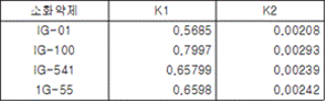 2.4.1.2 불활성기체소화약제는 다음 식 (2.4.1.2)에 따라 산출한 양 이상으로 할 것 X = 2.303(Vs / S) × Log10 [100 / (100 - C)] ··· (2.4.1.2) 여기에서 X: 공간체적당 더해진 소화약제의 부피(㎥/㎥) C: 체적에 따른 소화약제 설계농도(%) Vs: 20 °C에서 소화약제의 비체적(㎥/㎏) S: 소화약제별 선형상수(K1 + K2 × t)(㎥/㎏) ※ t: 방호구역의 최소예상온도(℃)