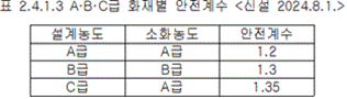 2.4.1.3 체적에 따른 소화약제의 설계농도(%)는 상온에서 제조업체의 설계기준에 따라 인증받은 소화농도(%)에 표 2.4.1.3에 따른 안전계수를 곱한 값 이상으로 할 것 <개정 2024. 8. 1.>