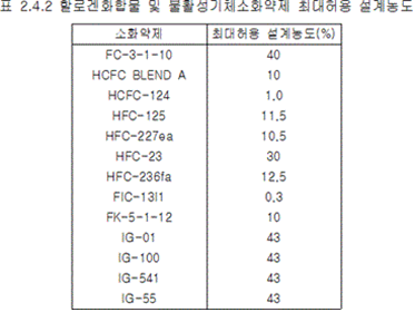 2.4.2 2.4.1의 기준에 의해 산출한 소화약제량은 사람이 상주하는 곳에서는 표 2.4.2에 따른 최대허용 설계농도를 초과할 수 없다.