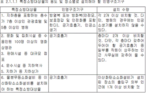 2. 기술기준 2.1 인명구조기구의 설치기준 2.1.1 인명구조기구는 다음의 기준에 따라 설치해야 한다. 2.1.1.1 특정소방대상물의 용도 및 장소별로 설치해야 할 인명구조기구는 표 2.1.1.1에 따라 설치할 것
