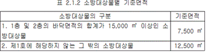 2. 기술기준 2.1 소화수조 등 2.1.1 소화수조 및 저수조의 채수구 또는 흡수관투입구는 소방차가 2 m 이내의 지점까지 접근할 수 있는 위치에 설치해야 한다. 2.1.2 소화수조 또는 저수조의 저수량은 소방대상물의 연면적을 다음 표 2.1.2에 따른 기준면적으로 나누어 얻은 수(소수점 이하의 수는 1로 본다)에 20 ㎥를 곱한 양 이상이 되도록 해야 한다.