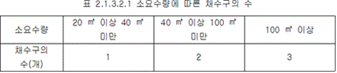 2.1.3 소화수조 또는 저수조는 다음의 기준에 따라 흡수관투입구 또는 채수구를 설치해야 한다. 2.1.3.1 지하에 설치하는 소화용수설비의 흡수관투입구는 그 한변이 0.6 m 이상이거나 직경이 0.6 m 이상인 것으로 하고, 소요수량이 80 ㎥ 미만인 것은 1개 이상, 80 ㎥ 이상인 것은 2개 이상을 설치해야 하며, "흡수관투입구"라고 표시한 표지를 할 것 2.1.3.2 소화용수설비에 설치하는 채수구는 다음의 기준에 따라 설치할 것 2.1.3.2.1 채수구는 다음 표 2.1.3.2.1에 따라 소방용호스 또는 소방용흡수관에 사용하는 구경 65 ㎜ 이상의 나사식 결합금속구를 설치할 것