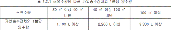2.1.3.2.2 채수구는 지면으로부터의 높이가 0.5 m 이상 1 m 이하의 위치에 설치하고 "채수구"라고 표시한 표지를 할 것 2.1.4 소화용수설비를 설치해야 할 특정소방대상물에 있어서 유수의 양이 0.8 ㎥/min 이상인 유수를 사용할 수 있는 경우에는 소화수조를 설치하지 않을 수 있다. 2.2 가압송수장치 2.2.1 소화수조 또는 저수조가 지표면으로부터의 깊이(수조 내부바닥까지의 길이를 말한다)가 4.5 m 이상인 지하에 있는 경우에는 다음 표 2.2.1에 따라 가압송수장치를 설치해야 한다. 다만, 2.1.2에 따른 저수량을 지표면으로부터 4.5 m 이하인 지하에서 확보할 수 있는 경우에는 소화수조 또는 저수조의 지표면으로부터의 깊이에 관계없이 가압송수장치를 설치하지 않을 수 있다.